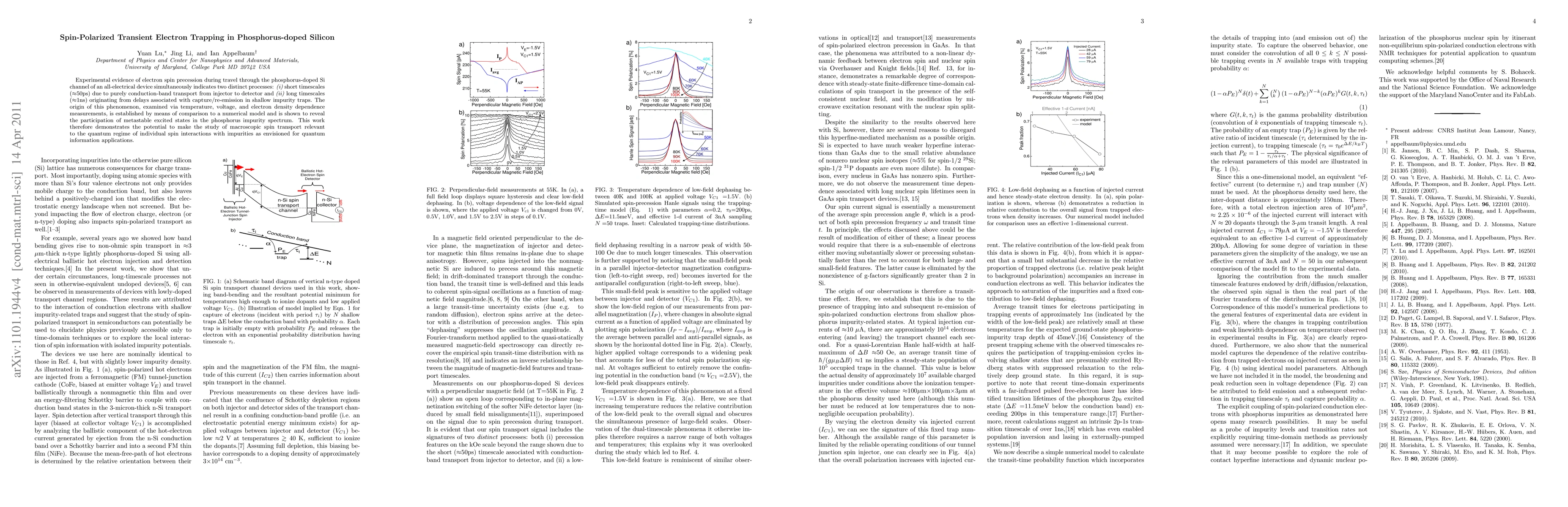Experimental evidence of electron spin precession during travel through the phosphorus-doped Si channel of an all-electrical device simultaneously indicates two distinct processes: (i) short timescales (~50ps) due to purely conduction-band transport from injector to detector, and (ii) long timescales (~1ns) originating from delays associated with capture/re-emission in shallow impurity traps. The origin of this phenomenon, examined via temperature, voltage, and electron density dependence measurements, is established by means of comparison to a numerical model and is shown to reveal the participation of metastable excited states in the phosphorus impurity spectrum. This work therefore demonstrates the potential to make the study of macroscopic spin transport relevant to the quantum regime of individual spin interactions with impurities as envisioned for quantum information applications.