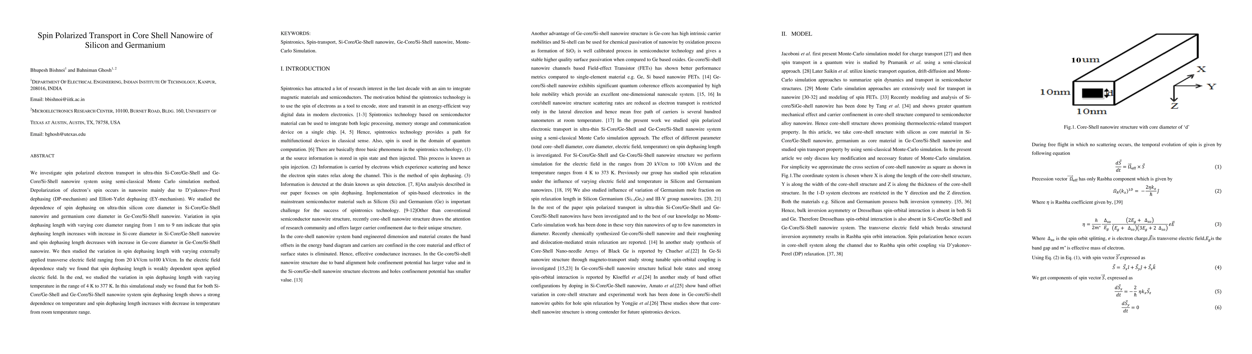 This paper investigates spin polarized transport in Si-Core/Ge-Shell and Ge-Core/Si-Shell nanowires using semi-classical Monte Carlo simulations, finding that spin dephasing length varies with core diameter and temperature, but is weakly dependent on applied electric fields.