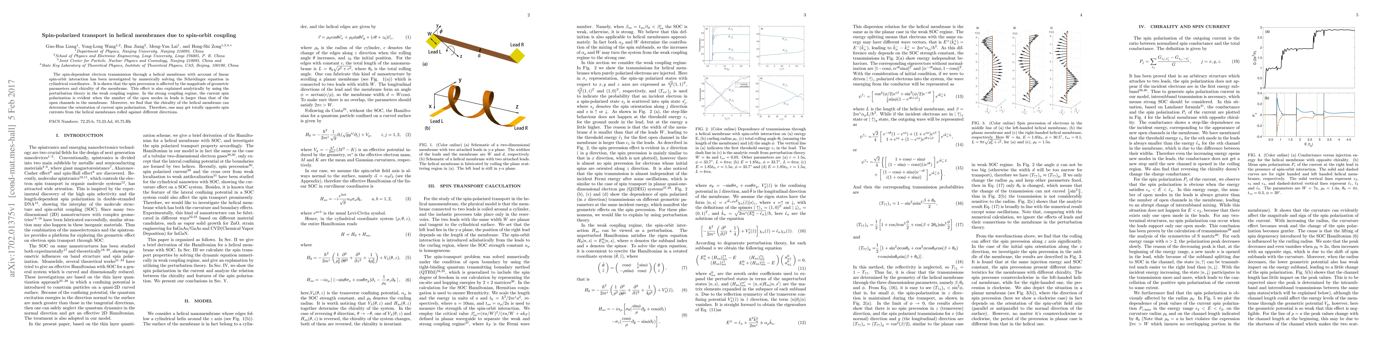 The spin-dependent electron transmission through a helical membrane with account of linear spin-orbit interaction has been investigated by numerically solving the Schr\"odinger equation in cylindrical coordinates . It is shown that the spin precession is affected by the magnitude of geometric parameters and chirality of the membrane. This effect is also explained analytically by using the perturbation theory in the weak coupling regime. In the strong coupling regime, the current spin polarization is evident when the number of the open modes in leads is larger than that of the open channels in the membrane. Moreover, we find that the chirality of the helical membrane can determine the orientation of current spin polarization. Therefore, one may get totally opposite spin currents from the helical membranes rolled against different directions.