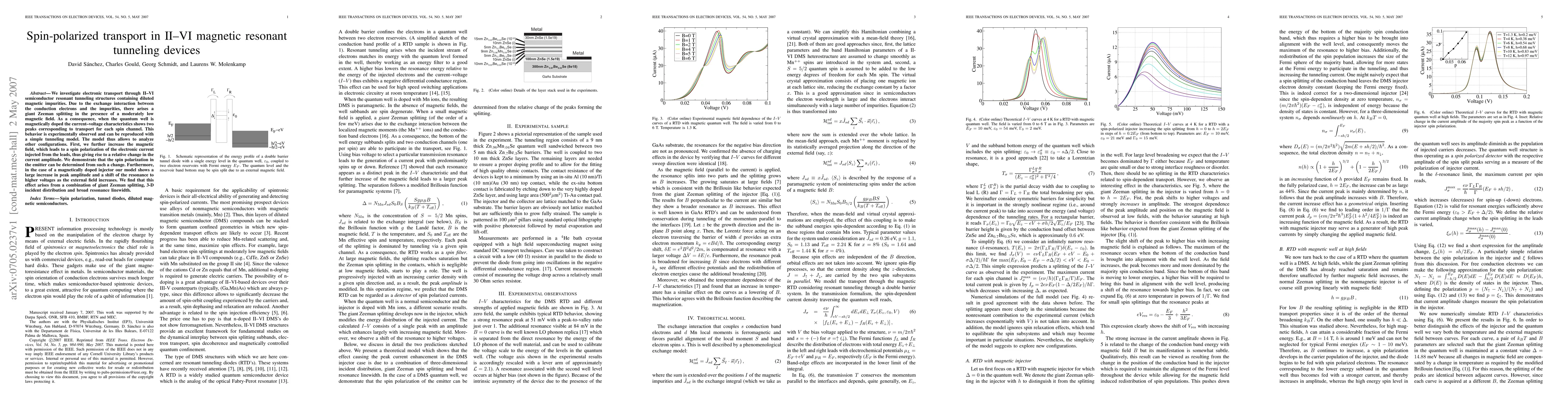 This paper investigates spin-polarized transport in II-VI semiconductor resonant tunneling devices with magnetic impurities, showing two current peaks per spin channel due to giant Zeeman splitting. The study demonstrates that increasing the magnetic field enhances spin polarization and alters current amplitude, providing a model to analyze various configurations.