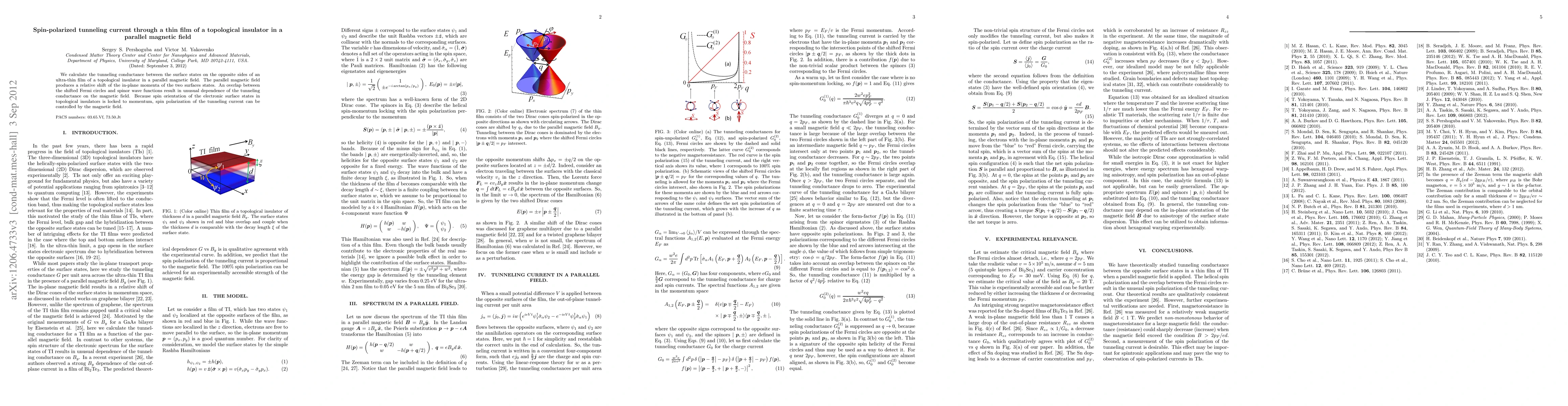 This study calculates the spin-polarized tunneling conductance through a thin topological insulator film under a parallel magnetic field, revealing a unique dependence of conductance on the field due to momentum shifts and spin-momentum locking in surface states. The magnetic field controls the spin-polarization of the tunneling current.
