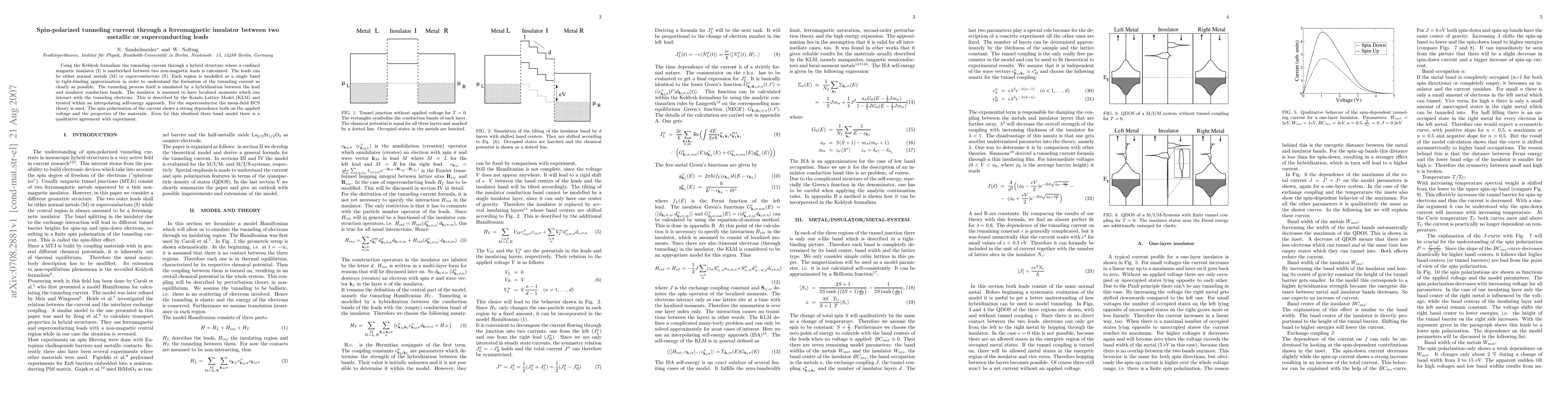 Using the Keldysh formalism the tunneling current through a hybrid structure where a confined magnetic insulator (I) is sandwiched between two non-magnetic leads is calculated. The leads can be either normal metals (M) or superconductors (S). Each region is modelled as a single band in tight-binding approximation in order to understand the formation of the tunneling current as clearly as possible. The tunneling process itself is simulated by a hybridization between the lead and insulator conduction bands. The insulator is assumed to have localized moments which can interact with the tunneling electrons. This is described by the Kondo Lattice Model (KLM) and treated within an interpolating self-energy approach. For the superconductor the mean-field BCS theory is used. The spin polarization of the current shows a strong dependence both on the applied voltage and the properties of the materials. Even for this idealized three band model there is a qualitative agreement with experiment.