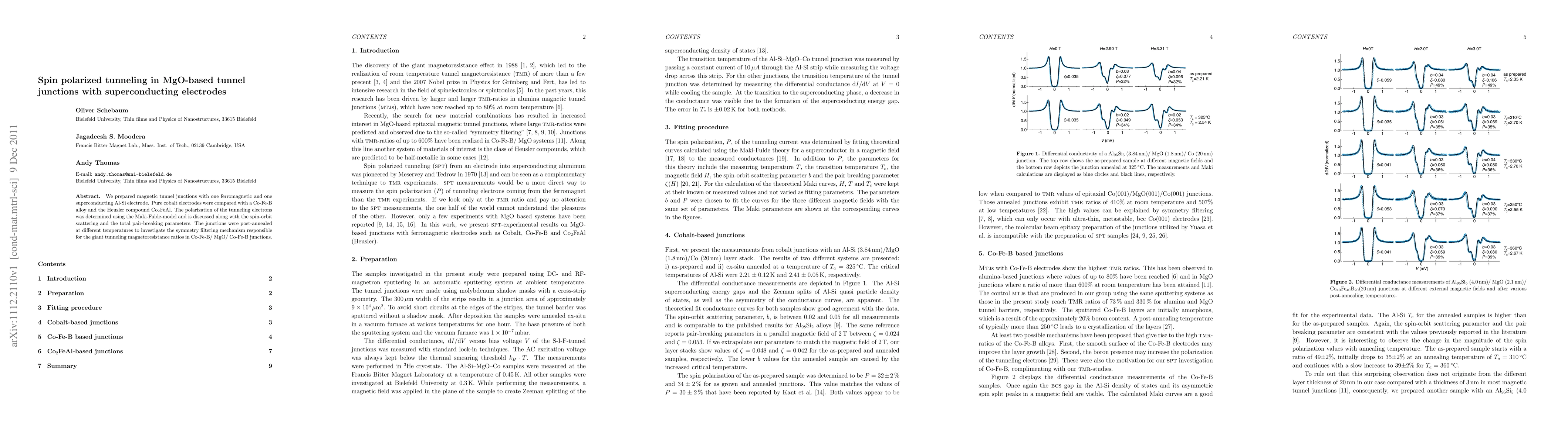 This study investigates spin-polarized tunneling in MgO-based tunnel junctions with superconducting Al-Si electrodes, comparing pure cobalt, Co-Fe-B alloy, and Co2FeAl. The research focuses on the polarization of tunneling electrons and the effects of post-annealing on the symmetry filtering mechanism for giant magnetoresistance.