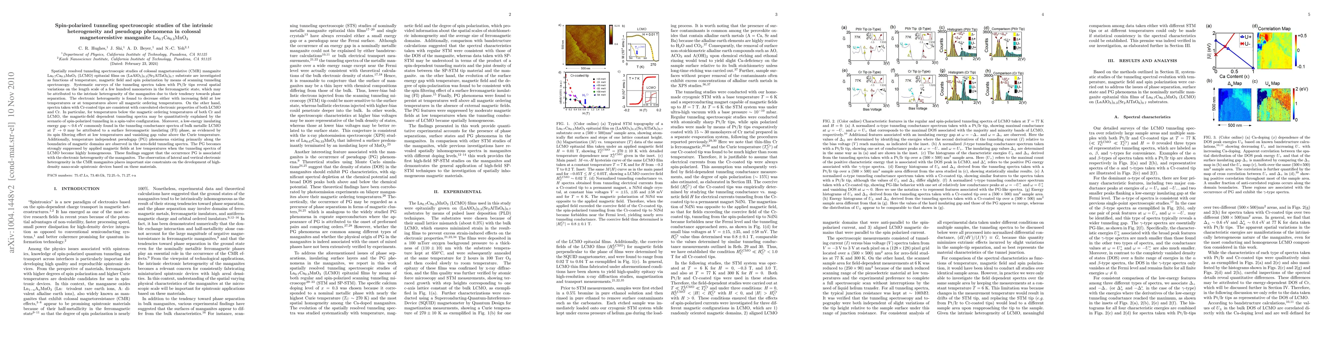 This paper investigates the intrinsic heterogeneity and pseudogap phenomena in colossal magnetoresistive manganite $\rm La_{0.7}Ca_{0.3}MnO_3}$ using spin-polarized tunneling spectroscopy. The study reveals spatial variations in the electronic properties due to phase separation, which diminish with magnetic field or higher temperatures, and identifies a pseudogap phenomenon linked to electronic heterogeneity.