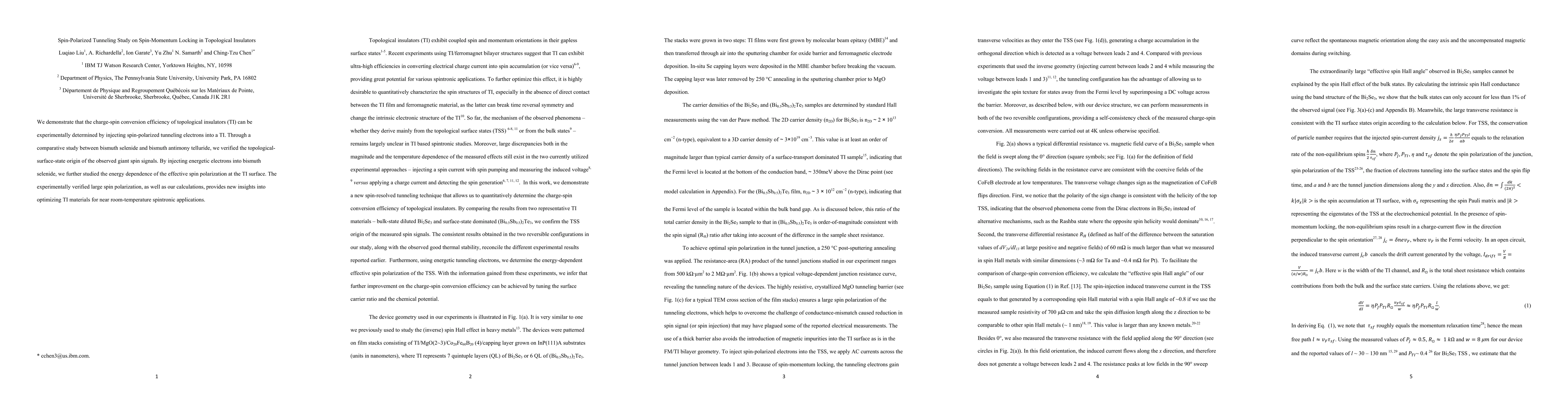 This study investigates spin-polarized tunneling in topological insulators, showing that charge-spin conversion efficiency can be experimentally measured by injecting spin-polarized electrons. Comparative analysis between bismuth selenide and bismuth antimony telluride confirms the topological-surface-state origin of the observed spin signals, with large spin polarization potentially optimizing materials for room-temperature spintronic applications.