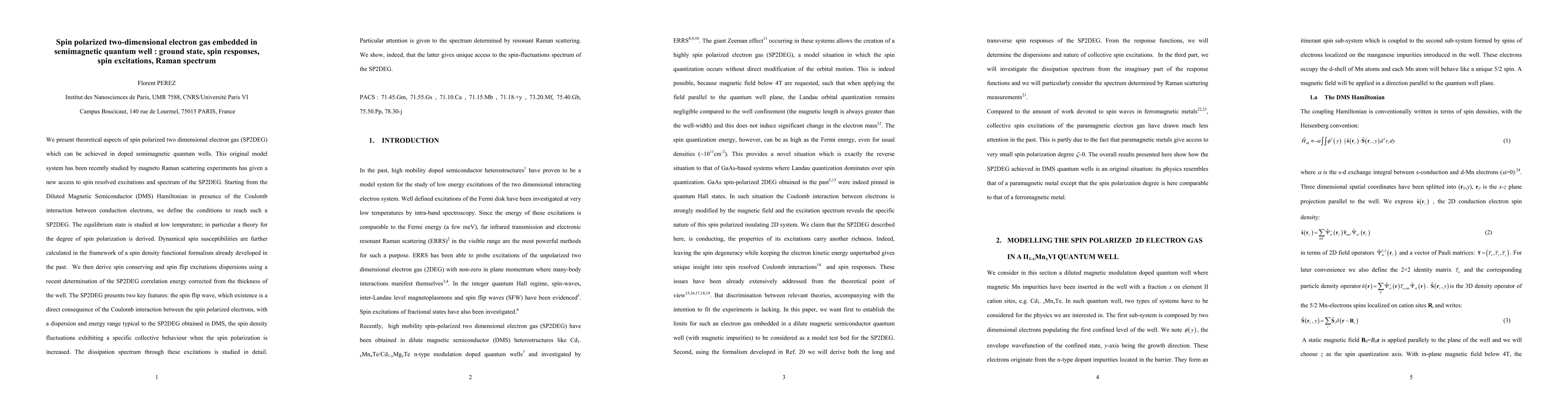 This paper theoretically explores spin polarized two-dimensional electron gas (SP2DEG) in semimagnetic quantum wells, deriving conditions for its formation and analyzing spin responses, excitations, and Raman spectrum. It highlights the spin flip wave and collective spin density fluctuations, with Raman scattering providing unique insights into the SP2DEG's spin-fluctuations spectrum.