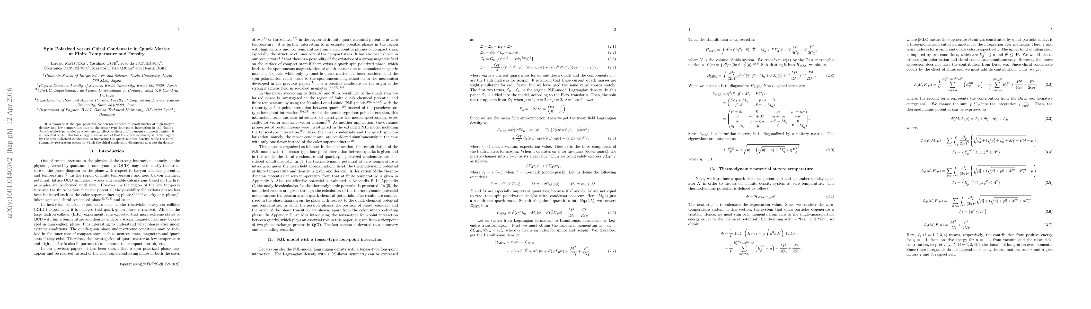 Summary: The study reveals that a spin polarized condensate emerges in quark matter at high baryon density and low temperature, driven by tensor-type four-point interactions in an Nambu-Jona-Lasinio model. This condensate breaks chiral symmetry, which is restored as density increases, leading to the disappearance of the chiral condensate.