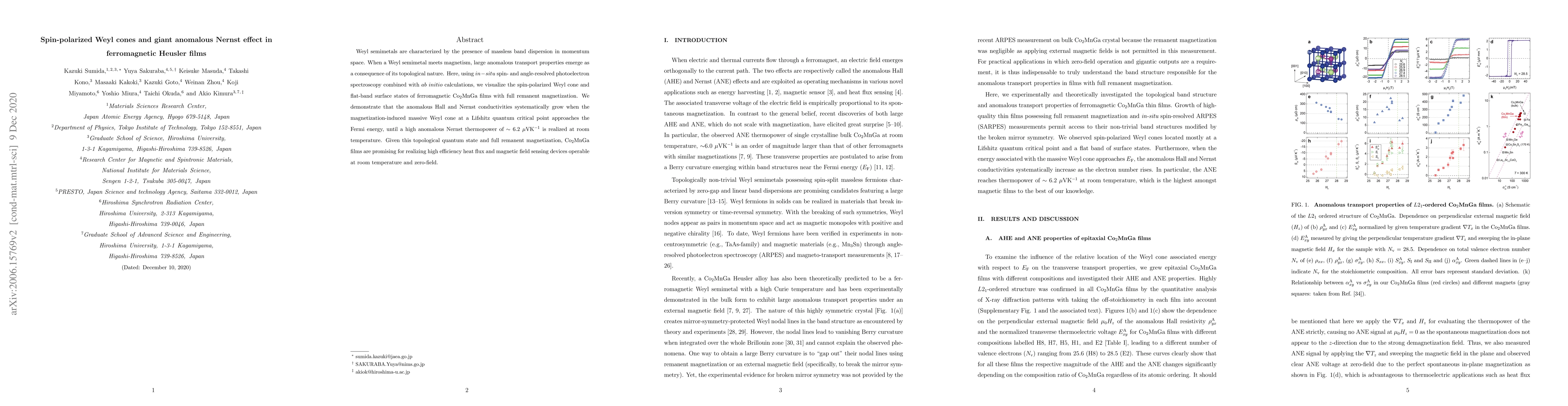 This paper demonstrates the visualization of spin-polarized Weyl cones in ferromagnetic Co$_2$MnGa films, revealing significant anomalous transport properties, including a high anomalous Nernst thermopower of $\sim 6.2$ $\rm \mu V K^{-1}$ at room temperature, indicating potential for efficient heat flux and magnetic field sensing devices.