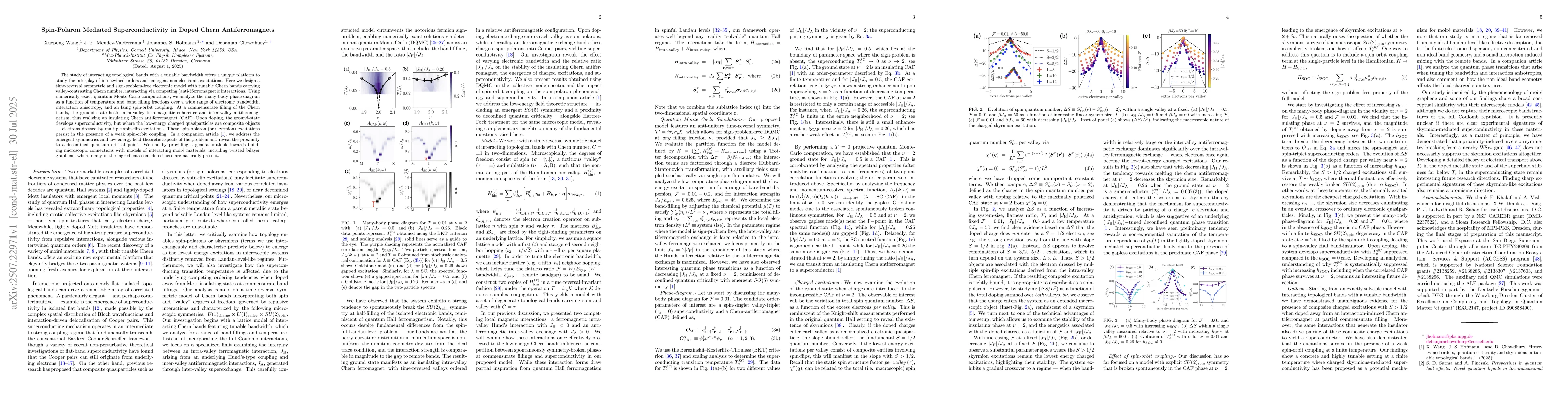 The study of interacting topological bands with a tunable bandwidth offers a unique platform to study the interplay of intertwined orders and emergent non-electronic excitations. Here we design a time-reversal symmetric and sign-problem-free electronic model with tunable Chern bands carrying valley-contrasting Chern number, interacting via competing (anti-)ferromagnetic interactions. Using numerically exact quantum Monte-Carlo computations, we analyze the many-body phase-diagram as a function of temperature and band filling fractions over a wide range of electronic bandwidth, interaction anisotropy, and an Ising spin-orbit coupling. At a commensurate filling of the Chern bands, the ground state hosts intra-valley ferromagnetic coherence and inter-valley antiferomagnetism, thus realizing an insulating Chern antiferromagnet (CAF). Upon doping, the ground-state develops superconductivity, but where the low-energy charged quasiparticles are composite objects -- electrons dressed by multiple spin-flip excitations. These spin-polaron (or skyrmion) excitations persist in the presence of a weak spin-orbit coupling. In a companion article, we address the emergent symmetries and low-energy field-theoretic aspects of the problem and reveal the proximity to a deconfined quantum critical point. We end by providing a general outlook towards building microscopic connections with models of interacting moir\'e materials, including twisted bilayer graphene, where many of the ingredients considered here are naturally present.