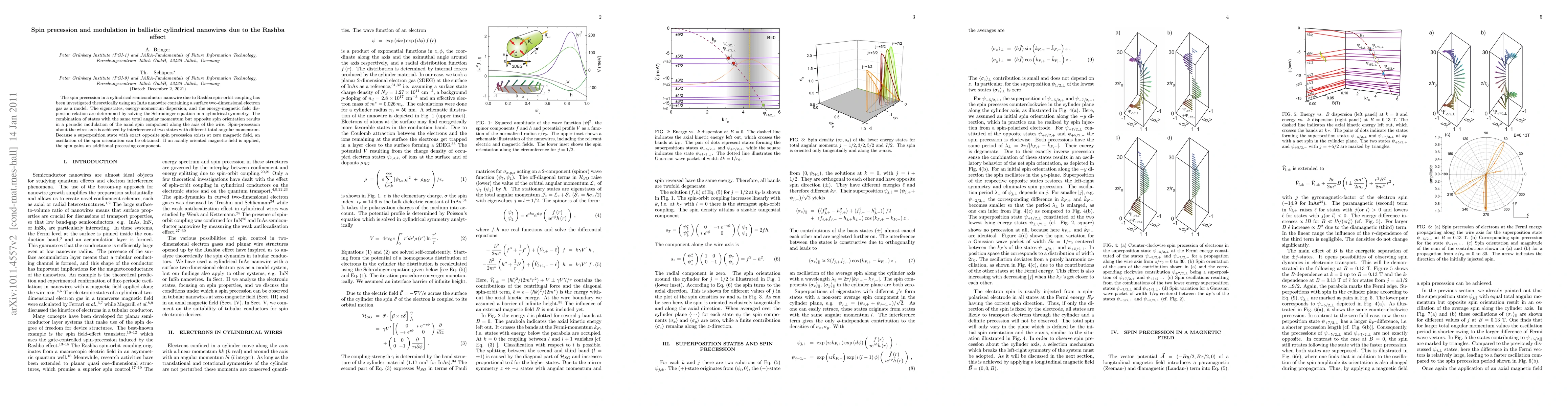 The spin precession in a cylindrical semiconductor nanowire due to Rashba spin-orbit coupling has been investigated theoretically using an InAs nanowire containing a surface two-dimensional electron gas as a model. The eigenstates, energy-momentum dispersion, and the energy-magnetic field dispersion relation are determined by solving the Schr\"odinger equation in a cylindrical symmetry The combination of states with the same total angular momentum but opposite spin orientation results in a periodic modulation of the axial spin component along the axis of the wire. Spin-precession about the wires axis is achieved by interference of two states with different total angular momentum. Because a superposition state with exact opposite spin precession exists at zero magnetic field, an oscillation of the spin orientation can be obtained. If an axially oriented magnetic field is applied, the spin gains an additional precessing component.
