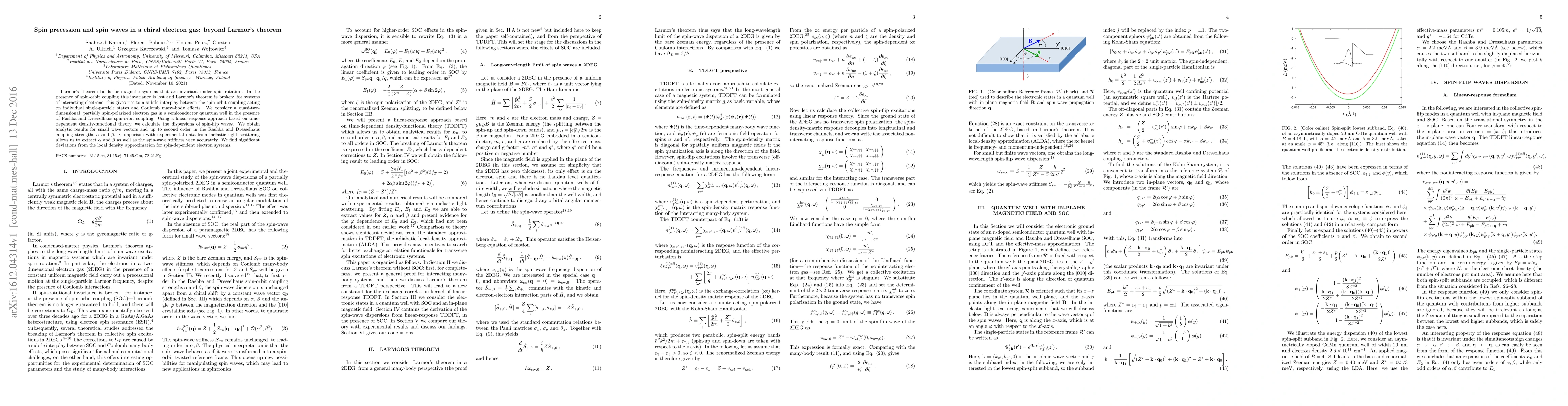 Larmor's theorem holds for magnetic systems that are invariant under spin rotation. In the presence of spin-orbit coupling this invariance is lost and Larmor's theorem is broken: for systems of interacting electrons, this gives rise to a subtle interplay between the spin-orbit coupling acting on individual single-particle states and Coulomb many-body effects. We consider a quasi-two-dimensional, partially spin-polarized electron gas in a semiconductor quantum well in the presence of Rashba and Dresselhaus spin-orbit coupling. Using a linear-response approach based on time-dependent density-functional theory, we calculate the dispersions of spin-flip waves. We obtain analytic results for small wave vectors and up to second order in the Rashba and Dresselhaus coupling strengths $\alpha$ and $\beta$. Comparison with experimental data from inelastic light scattering allows us to extract $\alpha$ and $\beta$ as well as the spin-wave stiffness very accurately. We find significant deviations from the local density approximation for spin-dependent electron systems.