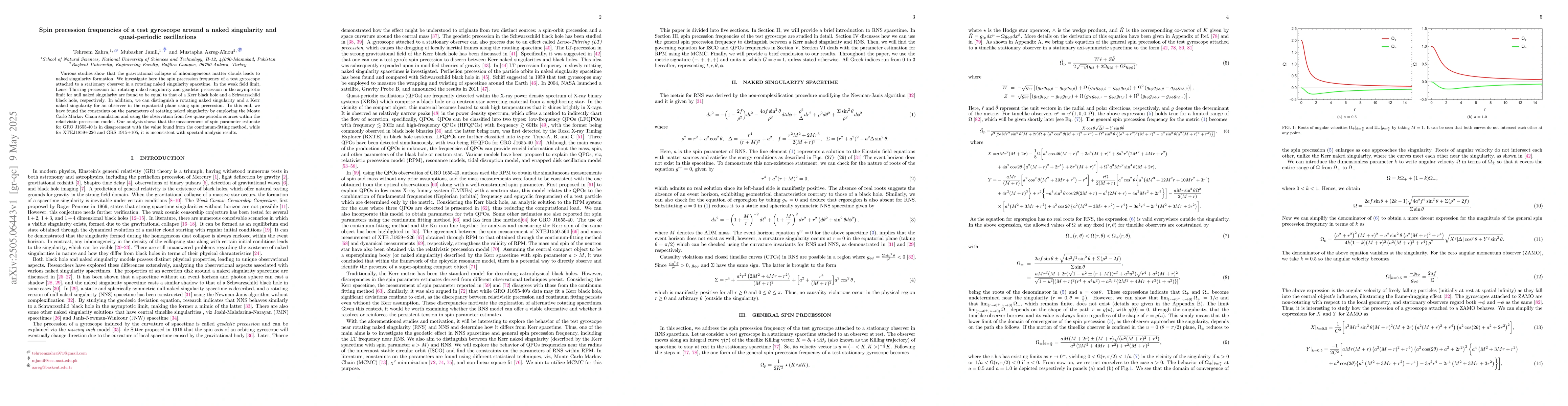 The study investigates spin precession frequencies of a test gyroscope around a rotating naked singularity using weak field limits and Monte Carlo Markov Chain simulations, comparing results with Kerr black holes and spectral analysis from quasi-periodic sources.