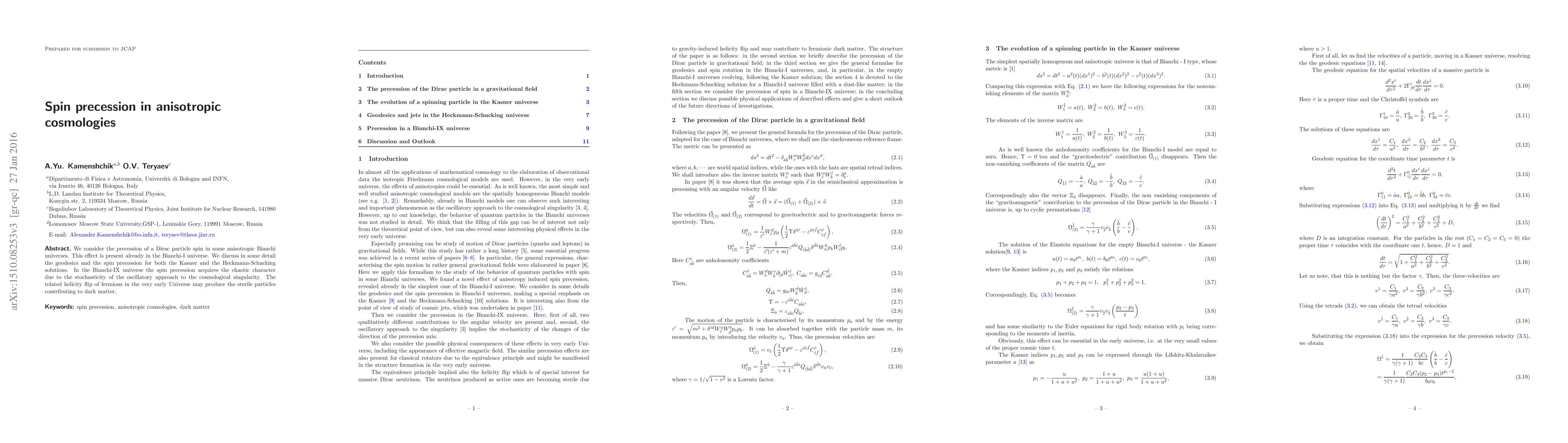 The paper examines spin precession of Dirac particles in anisotropic Bianchi cosmological models, finding significant precession even in Bianchi-I. In Bianchi-IX, precession becomes chaotic near the singularity, potentially causing helicity flips of fermions in early universe, which could generate sterile particles as dark matter candidates.