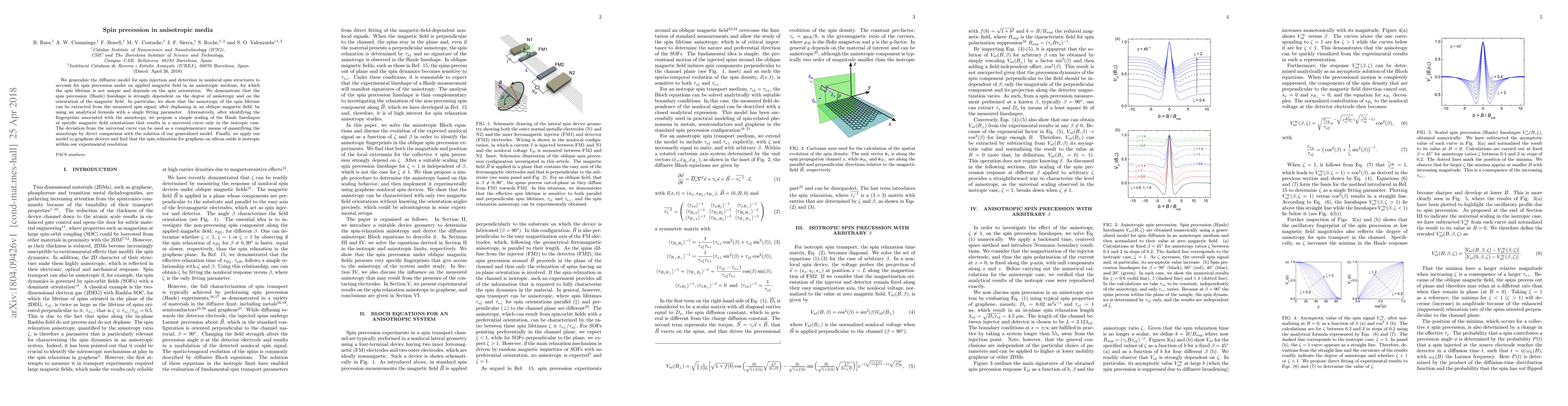 We generalize the diffusive model for spin injection and detection in nonlocal spin structures to account for spin precession under an applied magnetic field in an anisotropic medium, for which the spin lifetime is not unique and depends on the spin orientation.We demonstrate that the spin precession (Hanle) line shape is strongly dependent on the degree of anisotropy and on the orientation of the magnetic field. In particular, we show that the anisotropy of the spin lifetime can be extracted from the measured spin signal, after dephasing in an oblique magnetic field, by using an analytical formula with a single fitting parameter. Alternatively, after identifying the fingerprints associated with the anisotropy, we propose a simple scaling of the Hanle line shapes at specific magnetic field orientations that results in a universal curve only in the isotropic case. The deviation from the universal curve can be used as a complementary means of quantifying the anisotropy by direct comparison with the solution of our generalized model. Finally, we applied our model to graphene devices and find that the spin relaxation for graphene on silicon oxide is isotropic within our experimental resolution.