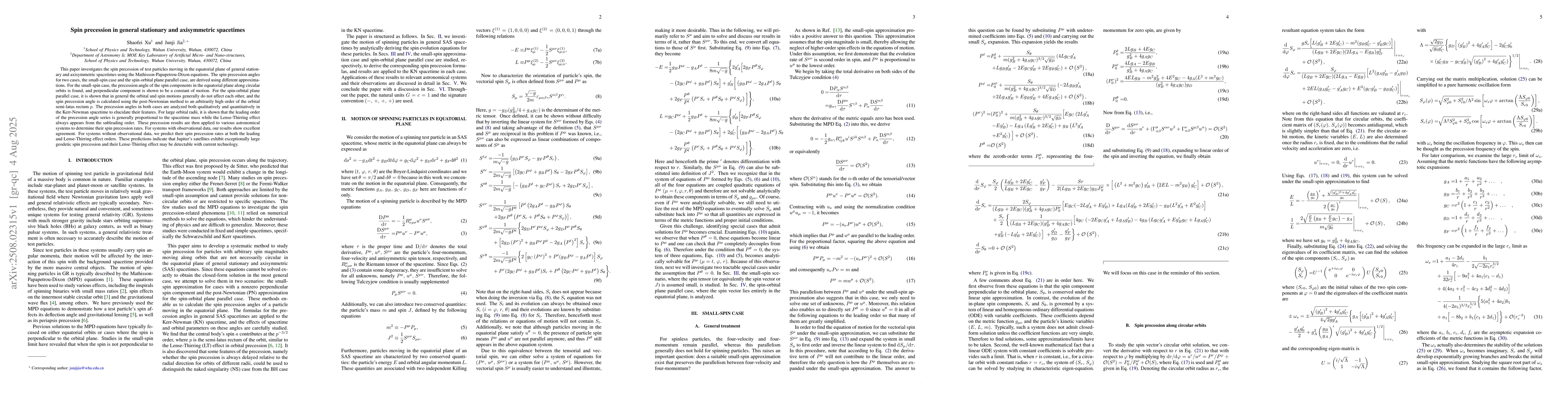 This paper investigates the spin precession of test particles moving in the equatorial plane of general stationary and axisymmetric spacetimes using the Mathisson-Papapetrou-Dixon equations. The spin precession angles for two cases, the small-spin case and the spin-orbital plane parallel case, are derived using different approximations. For the small-spin case, the precession angle of the spin components in the equatorial plane along circular orbits is found, and perpendicular component is shown to be a constant of motion. For the spin-orbital plane parallel case, it is shown that in general the orbital and spin motions generally do not affect each other, and the spin precession angle is calculated using the post-Newtonian method to an arbitrarily high order of the orbital semi-latus rectum p. The precession angles in both cases are analyzed both qualitatively and quantitatively in the Kerr-Newman spacetime to elucidate their features. For large orbital radii, it is shown that the leading order of the precession angle series is generally proportional to the spacetime mass while the Lense-Thirring effect always appears from the subleading order. These precession results are then applied to various astronomical systems to determine their spin precession rates. For systems with observational data, our results show excellent agreement. For systems without observational data, we predict their spin precession rates at both the leading and Lense-Thirring effect orders. These predictions indicate that Jupiter's satellites exhibit exceptionally large geodetic spin precession and their Lense-Thirring effect may be detectable with current technology.