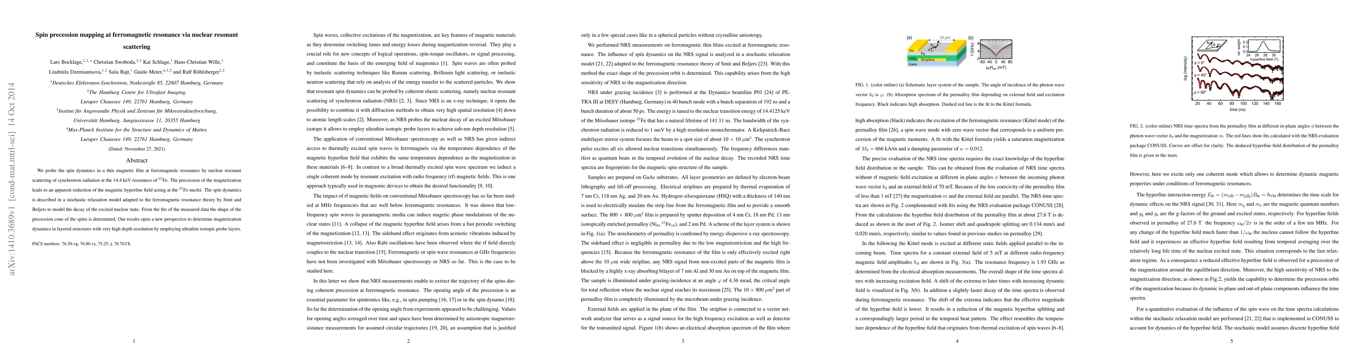 We probe the spin dynamics in a thin magnetic film at ferromagnetic resonance by nuclear resonant scattering of synchrotron radiation at the 14.4 keV resonance of $^{57}$Fe. The precession of the magnetization leads to an apparent reduction of the magnetic hyperfine field acting at the $^{57}$Fe nuclei. The spin dynamics is described in a stochastic relaxation model adapted to the ferromagnetic resonance theory by Smit and Beljers to model the decay of the excited nuclear state. From the fits of the measured data the shape of the precession cone of the spins is determined. Our results open a new perspective to determine magnetization dynamics in layered structures with very high depth resolution by employing ultrathin isotopic probe layers.