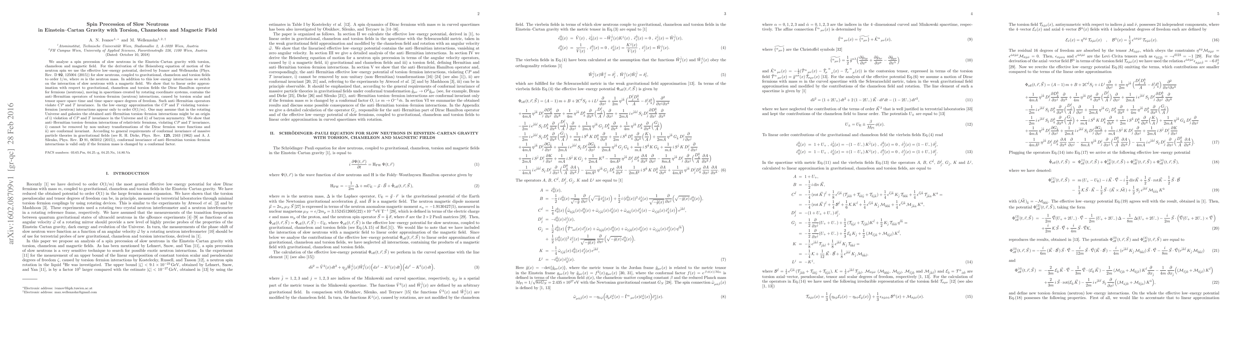 This paper investigates the spin precession of slow neutrons in the context of Einstein-Cartan gravity with torsion, chameleon fields, and magnetic fields. The study derives the Heisenberg equation of motion for neutron spin using an effective low-energy potential, revealing anti-Hermitian operators that violate CP and T invariance, potentially explaining the violation of these symmetries and baryon asymmetry in the Universe.