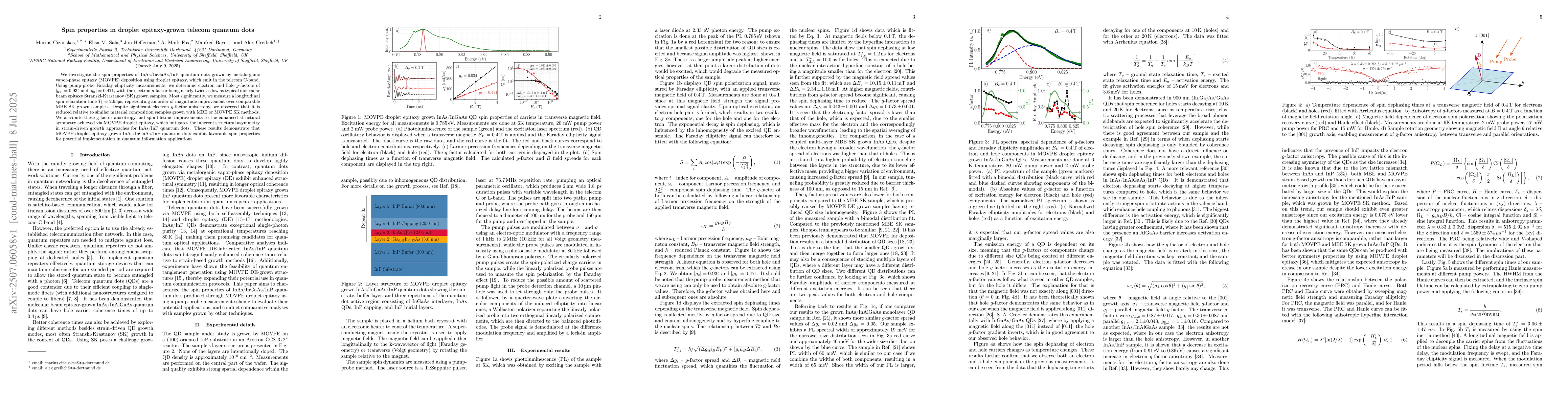 We investigate the spin properties of InAs/InGaAs/InP quantum dots grown by metalorganic vapor-phase epitaxy (MOVPE) deposition using droplet epitaxy, which emit in the telecom C-band. Using pump-probe Faraday ellipticity measurements, we determine electron and hole $g$-factors of $|g_e| = 0.934$ and $|g_h| = 0.471$, with the electron $g$-factor being nearly twice as low as typical molecular beam epitaxy Stranski-Krastanov (SK) grown samples. Most significantly, we measure a longitudinal spin relaxation time $T_1 = 2.95\,\mu s$, representing an order of magnitude improvement over comparable MBE SK grown samples. Despite significant electron $g$-factor anisotropy, we observed that it is reduced relative to similar material composition samples grown with MBE or MOVPE SK methods. We attribute these g-factor anisotropy and spin lifetime improvements to the enhanced structural symmetry achieved via MOVPE droplet epitaxy, which mitigates the inherent structural asymmetry in strain-driven growth approaches for InAs/InP quantum dots. These results demonstrate that MOVPE droplet epitaxy-grown InAs/InGaAs/InP quantum dots exhibit favorable spin properties for potential implementation in quantum information applications.
