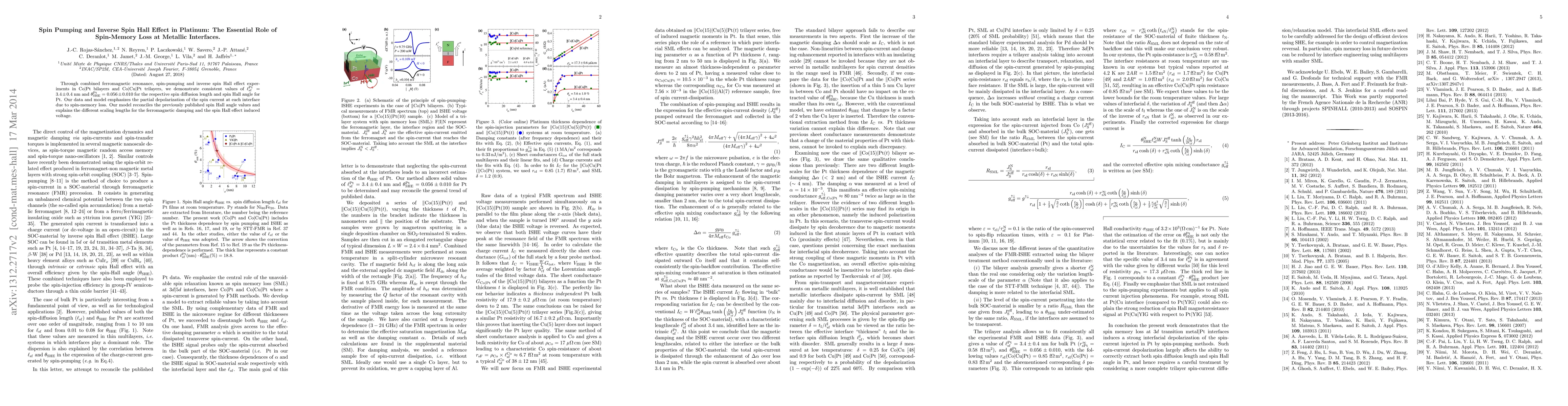 This paper investigates spin pumping and the inverse spin Hall effect in Pt, revealing spin diffusion length $\ell_{\rm sf}^{\rm Pt}=3.4\pm0.4$ nm and spin Hall angle $\theta_{\rm SHE}^{\rm Pt}=0.051\pm0.004$ for Pt. It highlights the role of spin-memory loss at metallic interfaces in partially depolarizing the spin current, providing a model that reconciles previous spin Hall angle values and explains different scaling lengths for damping and induced voltage.
