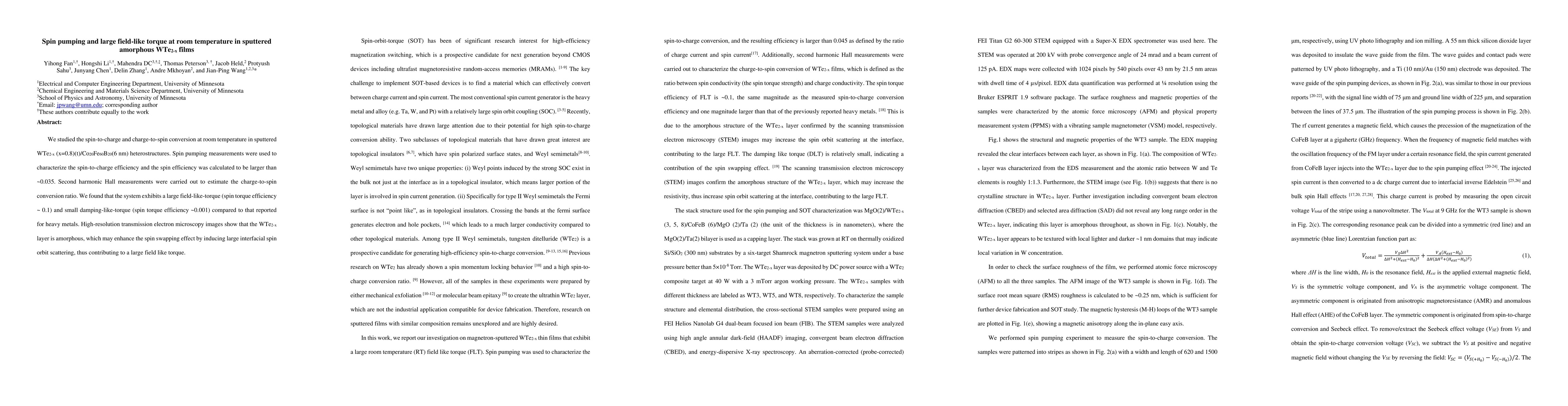 We studied the spin-to-charge and charge-to-spin conversion at room temperature in sputtered WTe2-x (x=0.8)(t)/Co20Fe60B20(6 nm) heterostructures. Spin pumping measurements were used to characterize the spin-to-charge efficiency and the spin efficiency was calculated to be larger than ~0.035. Second harmonic Hall measurements were carried out to estimate the charge-to-spin conversion ratio. We found that the system exhibits a large field-like-torque (spin torque efficiency ~ 0.1) and small damping-like-torque (spin torque efficiency ~0.001) compared to that reported for heavy metals. High-resolution transmission electron microscopy images show that the WTe2-x layer is amorphous, which may enhance the spin swapping effect by inducing large interfacial spin orbit scattering, thus contributing to a large field like torque.
