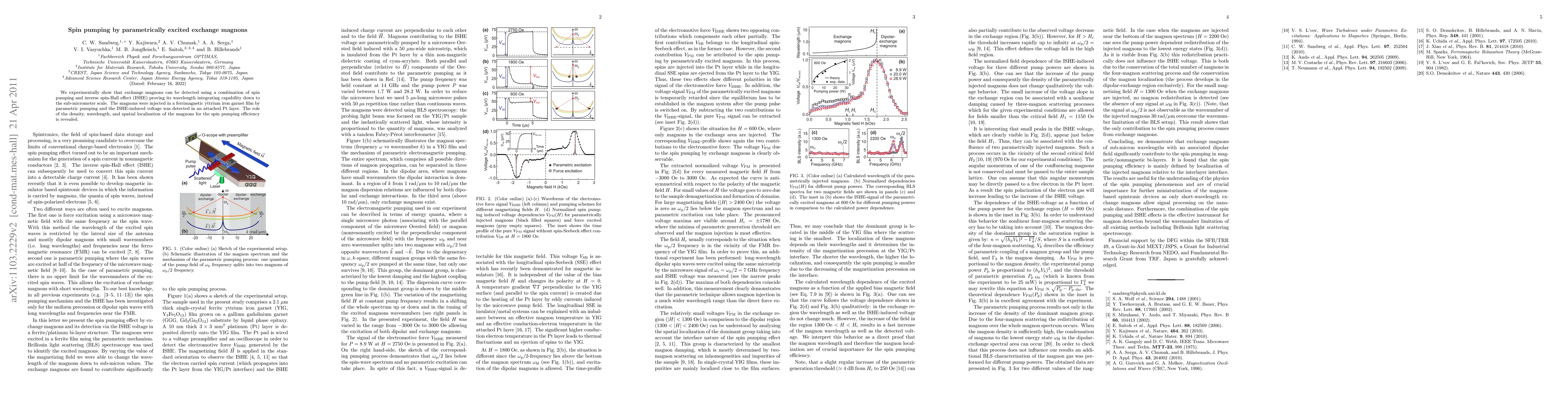 This research demonstrates the detection of exchange magnons via spin pumping and inverse spin-Hall effect, revealing the efficiency of magnon-based information processing at sub-micrometer scales. Magnons were parametrically excited in a ferrimagnetic film, and their spatial and wavelength characteristics were shown to influence spin pumping efficiency.