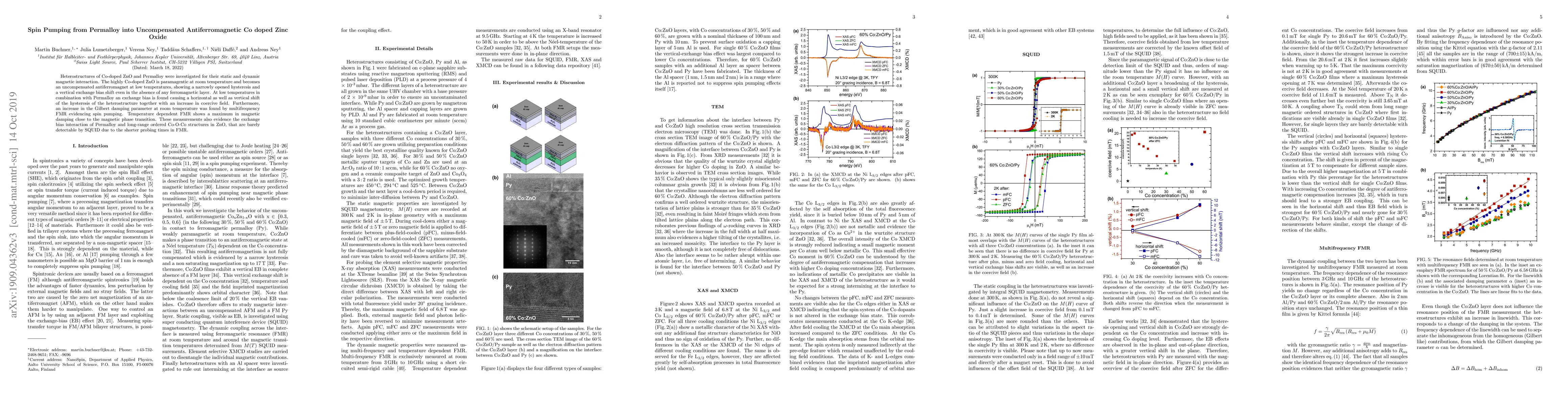 Heterostructures of Co-doped ZnO and Permalloy were investigated for their static and dynamic magnetic interaction. The highly Co-doped ZnO is paramagentic at room temperature and becomes an uncompensated antiferromagnet at low temperatures, showing a narrowly opened hysteresis and a vertical exchange bias shift even in the absence of any ferromagnetic layer. At low temperatures in combination with Permalloy an exchange bias is found causing a horizontal as well as vertical shift of the hysteresis of the heterostructure together with an increase in coercive field. Furthermore, an increase in the Gilbert damping parameter at room temperature was found by multifrequency FMR evidencing spin pumping. Temperature dependent FMR shows a maximum in magnetic damping close to the magnetic phase transition. These measurements also evidence the exchange bias interaction of Permalloy and long-range ordered Co-O-Co structures in ZnO, that are barely detectable by SQUID due to the shorter probing times in FMR.