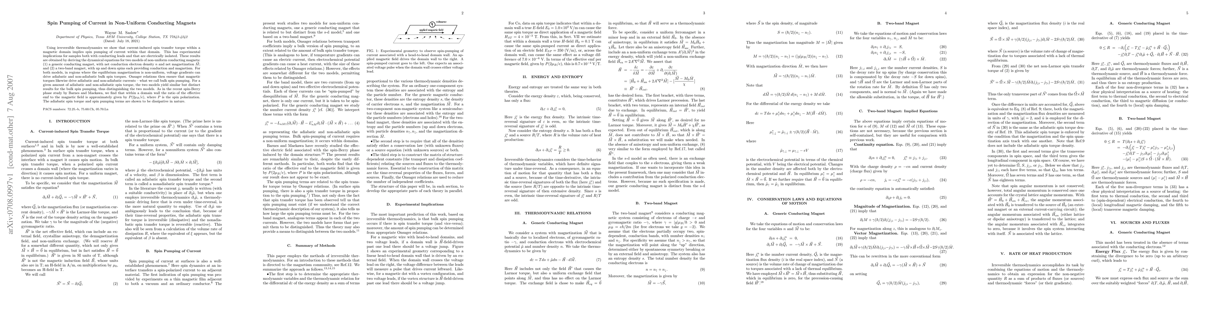 This paper demonstrates that current-induced spin transfer torque within magnetic domains leads to spin pumping of current, with implications for both conducting and isolated magnetic samples. The study uses irreversible thermodynamics to derive dynamical equations for two non-uniform conducting magnet models, showing that voltage gradients can drive spin torques and that magnetic torques can induce currents, termed bulk spin pumping.