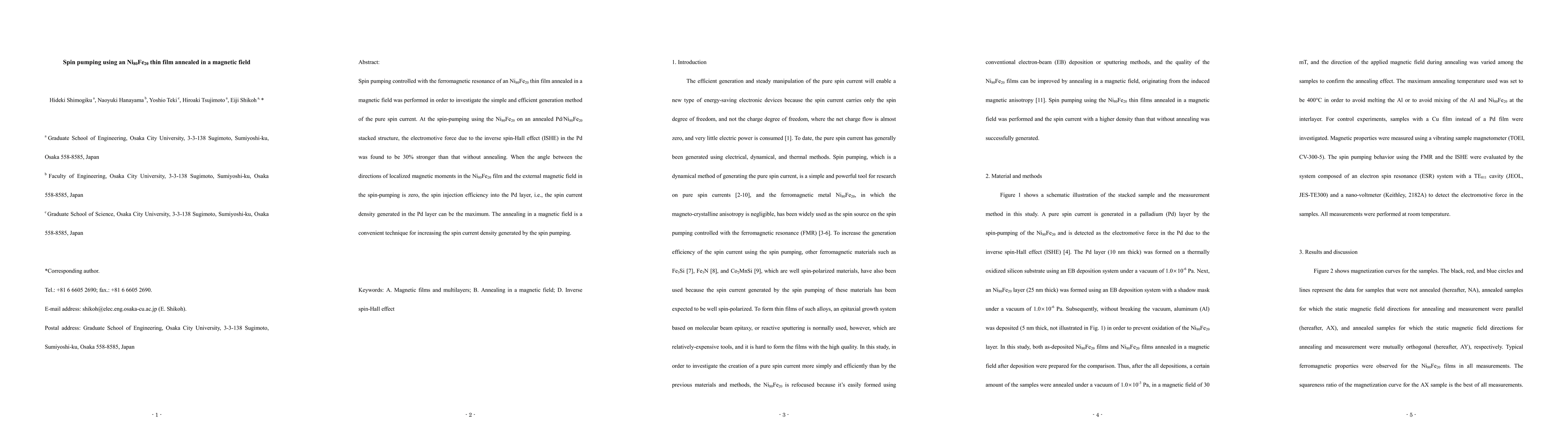 Spin pumping controlled with the ferromagnetic resonance of an Ni80Fe20 thin film annealed in a magnetic field was performed in order to investigate the simple and efficient generation method of the pure spin current. At the spin-pumping using the Ni80Fe20 on an annealed Pd/Ni80Fe20 stacked structure, the electromotive force due to the inverse spin-Hall effect (ISHE) in the Pd was found to be 30% stronger than that without annealing. When the angle between the directions of localized magnetic moments in the Ni80Fe20 film and the external magnetic field in the spin-pumping is zero, the spin injection efficiency into the Pd layer, i.e., the spin current density generated in the Pd layer can be the maximum. The annealing in a magnetic field is a convenient technique for increasing the spin current density generated by the spin pumping.