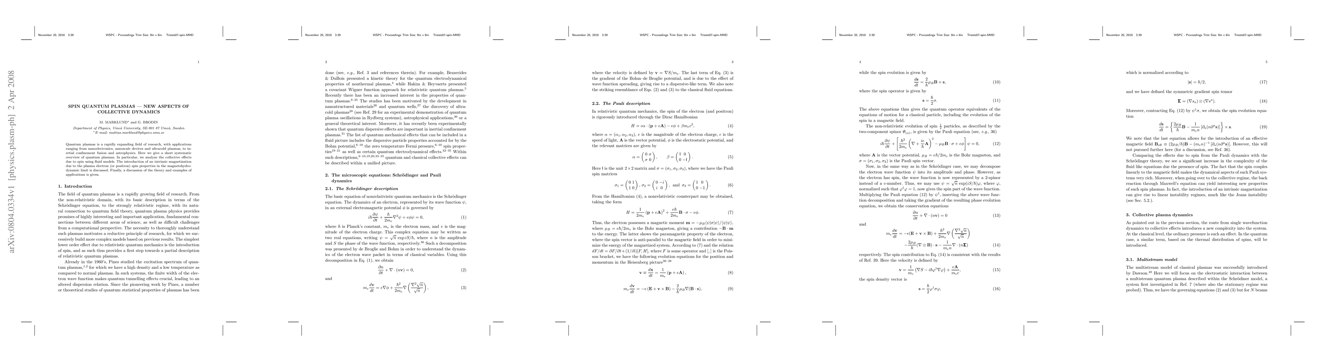 This paper provides a systematic overview of quantum plasmas, focusing on collective dynamics influenced by spin effects. It introduces the concept of intrinsic magnetization from electron or positron spin properties in the magnetohydrodynamic limit, and discusses theoretical implications and applications in various fields.