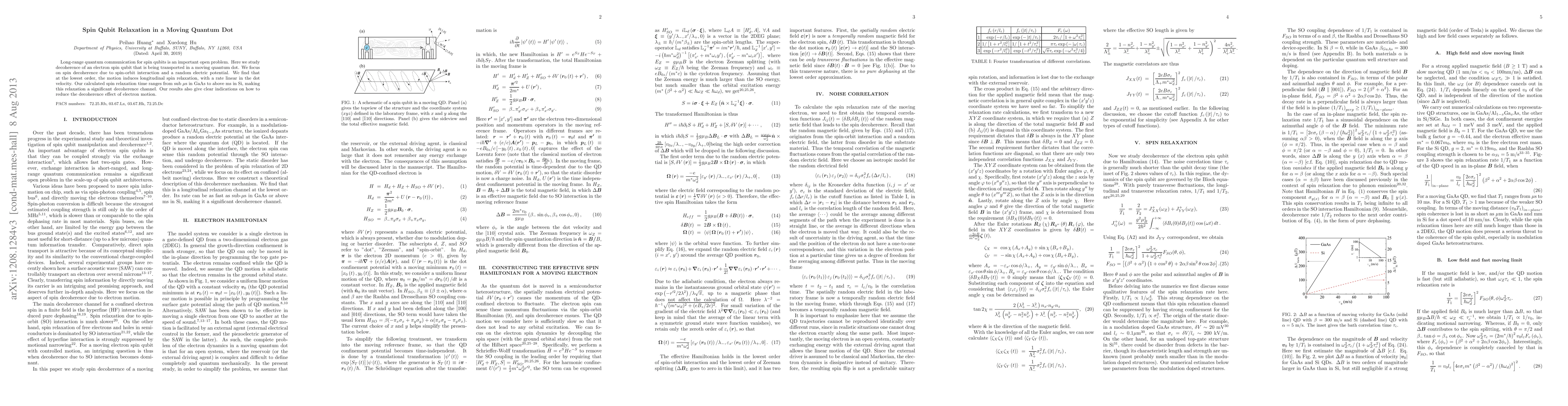 This study investigates spin qubit relaxation in a moving quantum dot, revealing that motion induces longitudinal spin relaxation with a rate proportional to the dot's velocity. The findings highlight the significant decoherence effects, ranging from sub-microseconds in GaAs to milliseconds in Si, and suggest methods to mitigate these effects.