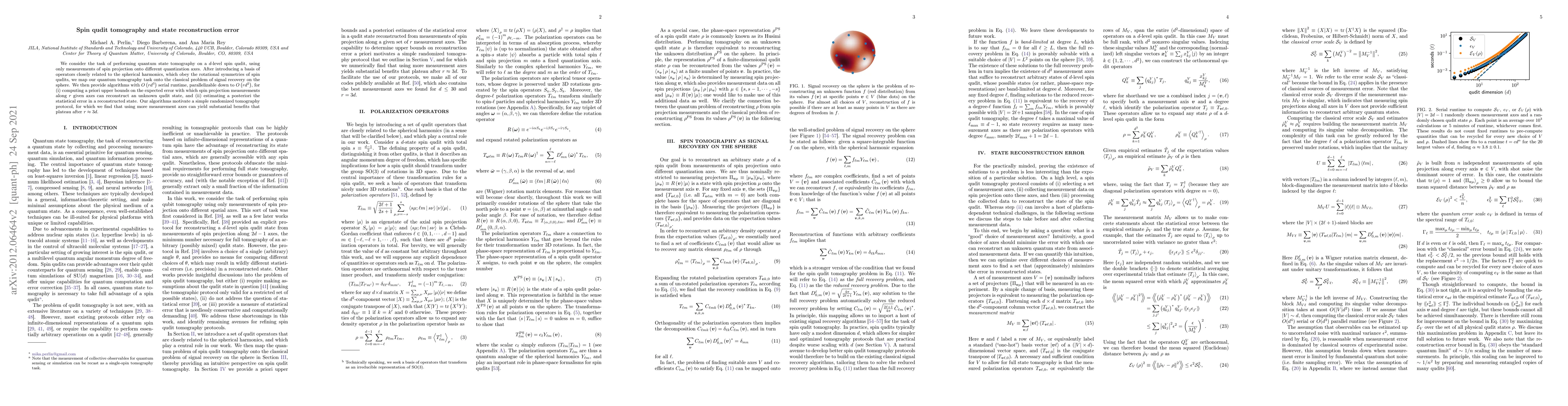 This paper develops algorithms for quantum state tomography of $d$-level spin qudits, focusing on reconstructing states using spin projection measurements. It provides methods to compute error bounds and estimate statistical errors, revealing that while more measurement axes improve accuracy, benefits plateau after around $3d$ axes.