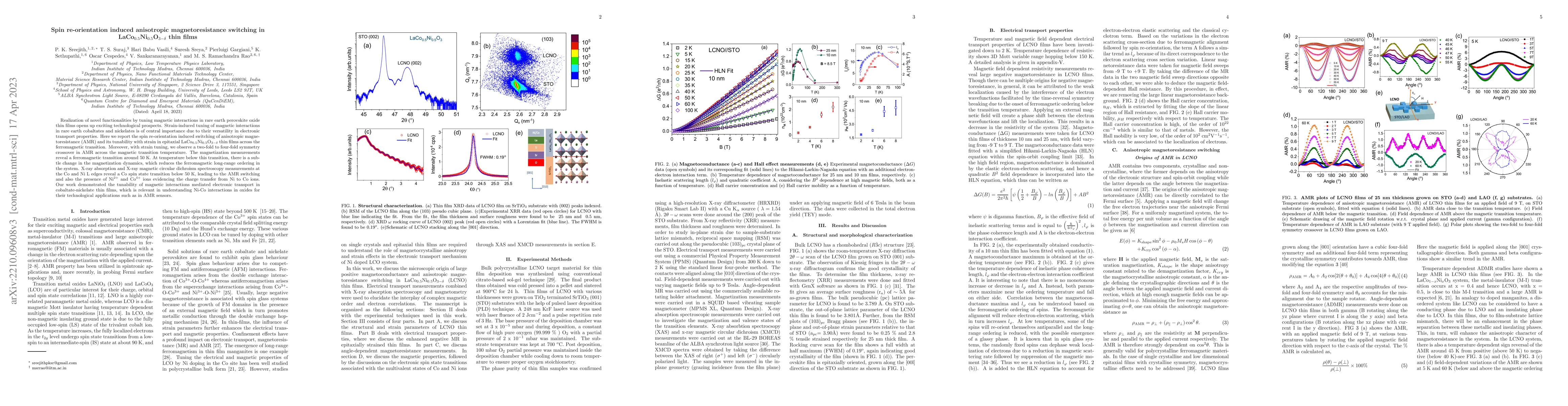 This study investigates the strain-induced spin re-orientation and tunable anisotropic magnetoresistance (AMR) in epitaxial LaCo$_{0.5}$Ni$_{0.5}$O$_{3-\delta}$ thin films, demonstrating a symmetry crossover in AMR near the ferromagnetic transition and revealing Co spin state changes via spectroscopy. The findings underscore the potential of these materials for advanced AMR sensor applications.