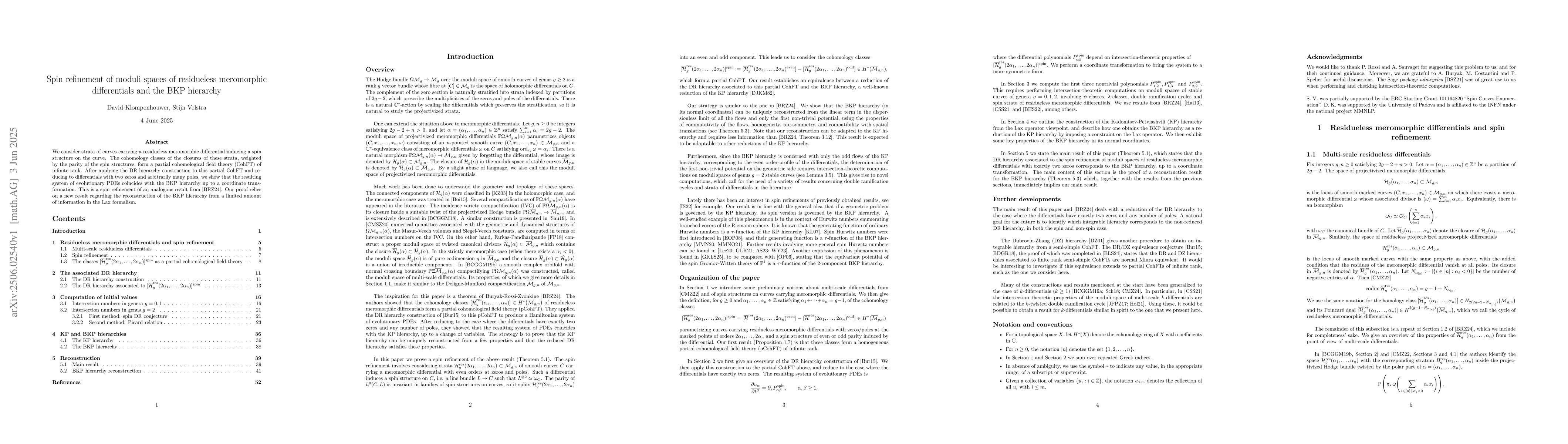 The paper presents a novel method for connecting spin-refined moduli spaces of residueless meromorphic differentials to the BKP hierarchy using the DR hierarchy construction and a partial CohFT.
