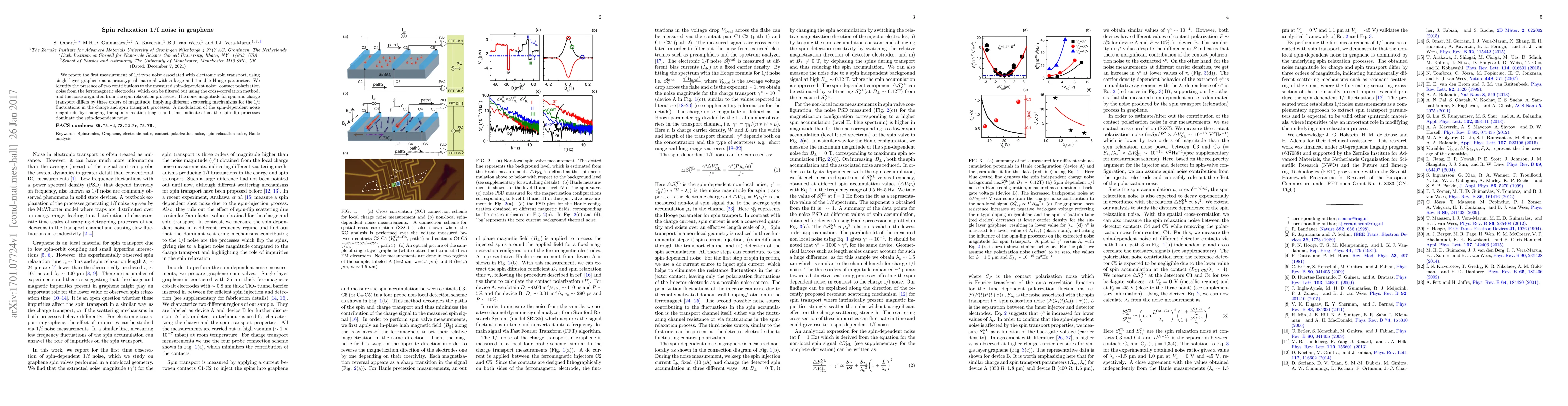This study measures 1/f noise in spin transport in graphene, identifying two noise sources: contact polarization noise from ferromagnetic electrodes and spin relaxation noise. The significant difference in noise magnitude between spin and charge transport suggests distinct scattering mechanisms for 1/f fluctuations, with spin-flip processes dominating the spin-dependent noise.