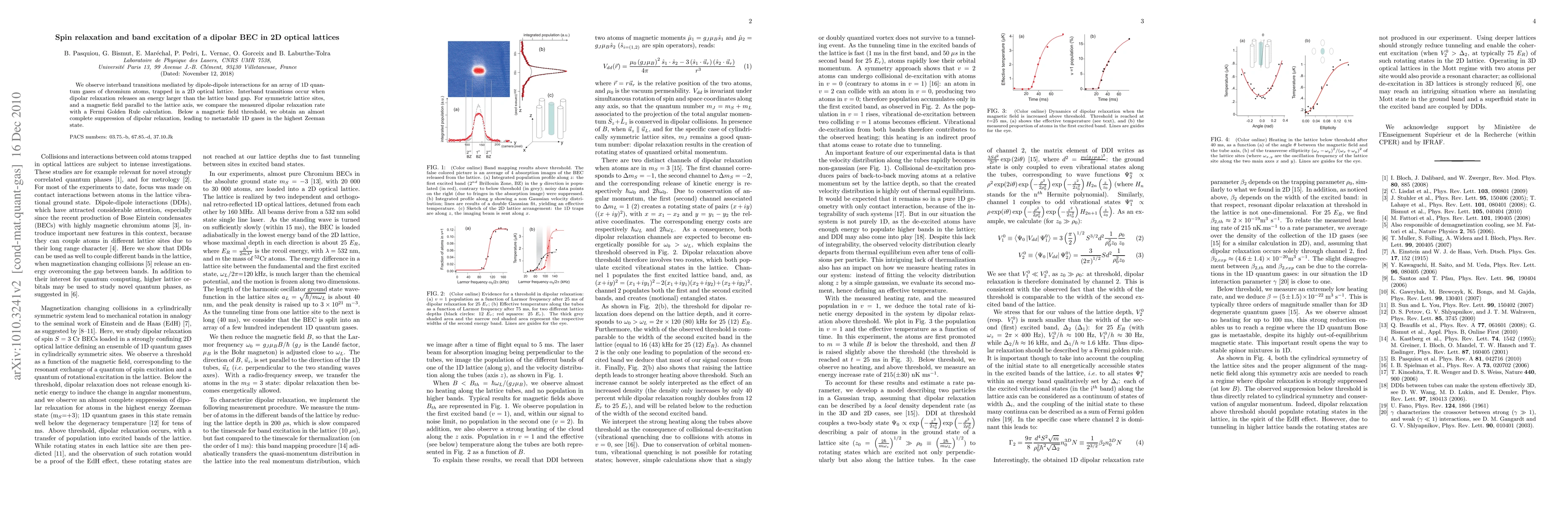 We observe interband transitions mediated by the dipole-dipole interaction for an array of 1D quantum gases of chromium atoms, trapped in a 2D optical lattice. Interband transitions occur when dipolar relaxation releases an energy which matches or overcomes the lattice band gap. We analyze the role of tunneling in higher lattice bands on this process. We compare the experimental dipolar relaxation rate with a calculation based on a multiple Fermi Golden Rule approach, when the lattice sites are symmetric, and the magnetic field is parallel to the lattice axis. We also show that an almost complete suppression of dipolar relaxation is obtained below a magnetic field threshold set by the depth of the lattice: 1D quantum gases in an excited Zeeman state then become metastable.