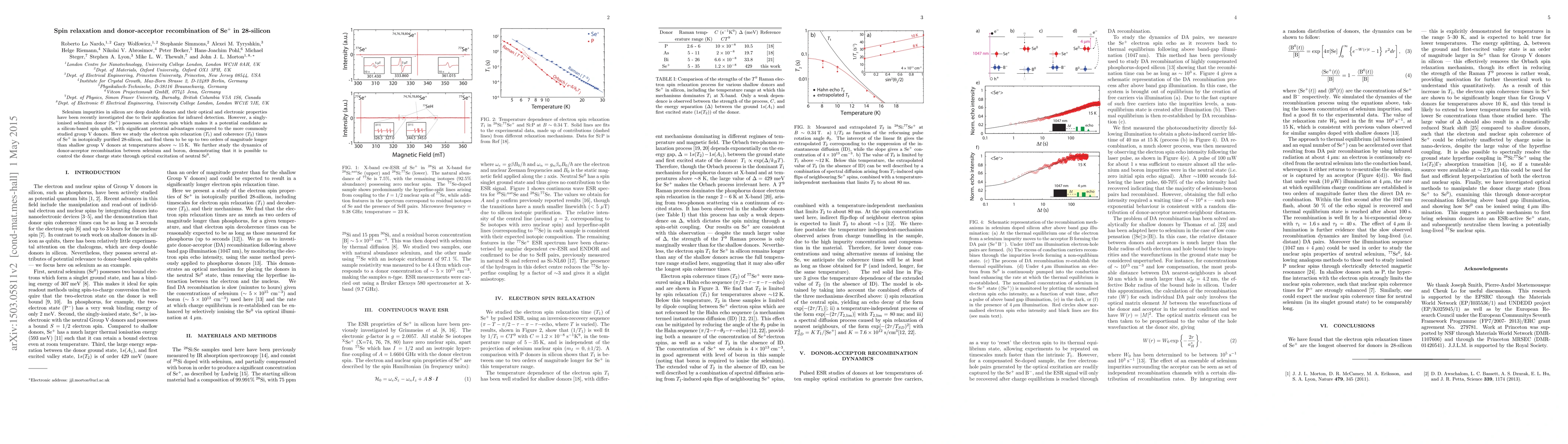 This paper investigates the electron spin relaxation and coherence times of singly-ionized selenium (Se$^+$) in 28-silicon, finding them significantly longer than those of shallow group V donors above 15 K. Additionally, it explores the dynamics of donor-acceptor recombination between selenium and boron, showing that the charge state of Se$^+$ can be controlled via optical excitation.