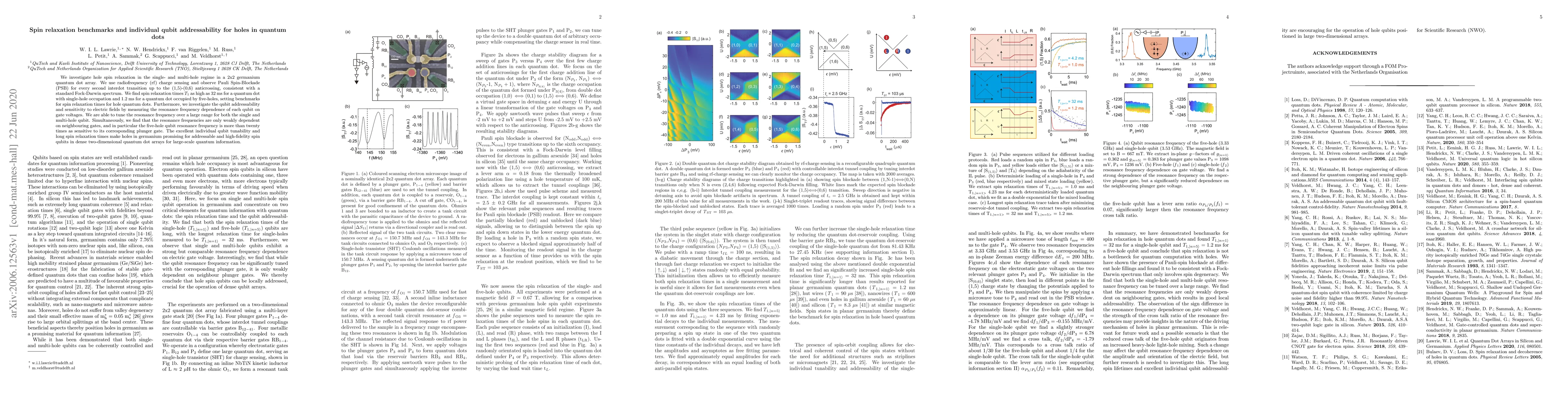This paper benchmarks spin relaxation times in germanium quantum dots, achieving $T_1$ up to 32 ms for single-hole occupation, and demonstrates qubit addressability with high sensitivity to electric fields, showing potential for scalable quantum information processing.