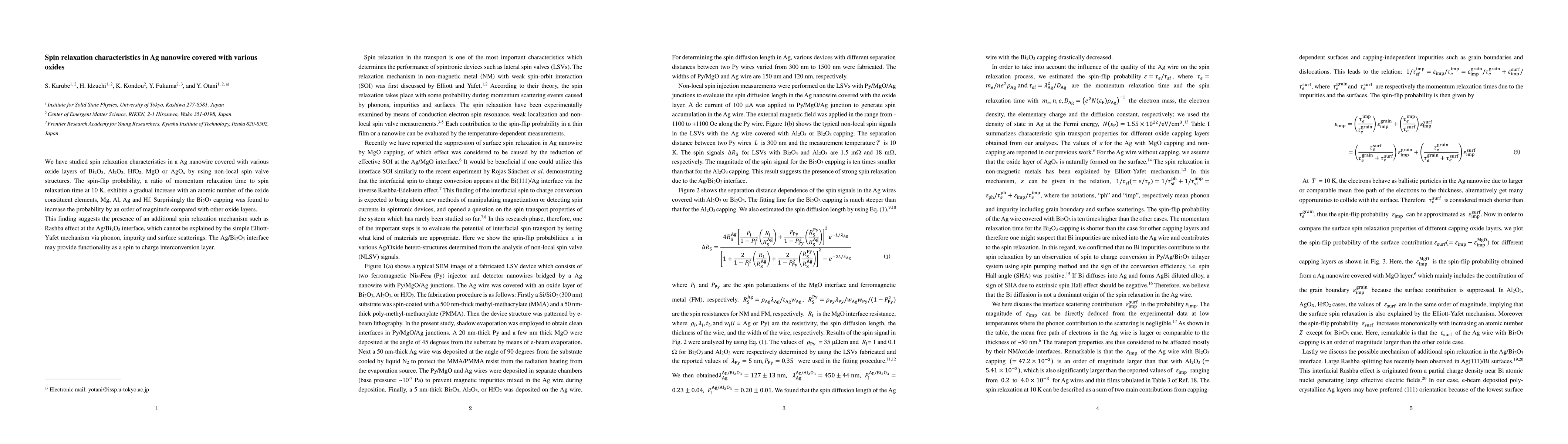 This study investigates spin relaxation in Ag nanowires covered by different oxide layers (Bi2O3, Al2O3, HfO2, MgO, AgOx) using non-local spin valve structures, revealing that Bi2O3 capping significantly enhances spin-flip probability, suggesting an additional spin relaxation mechanism at the Ag/Bi2O3 interface.
