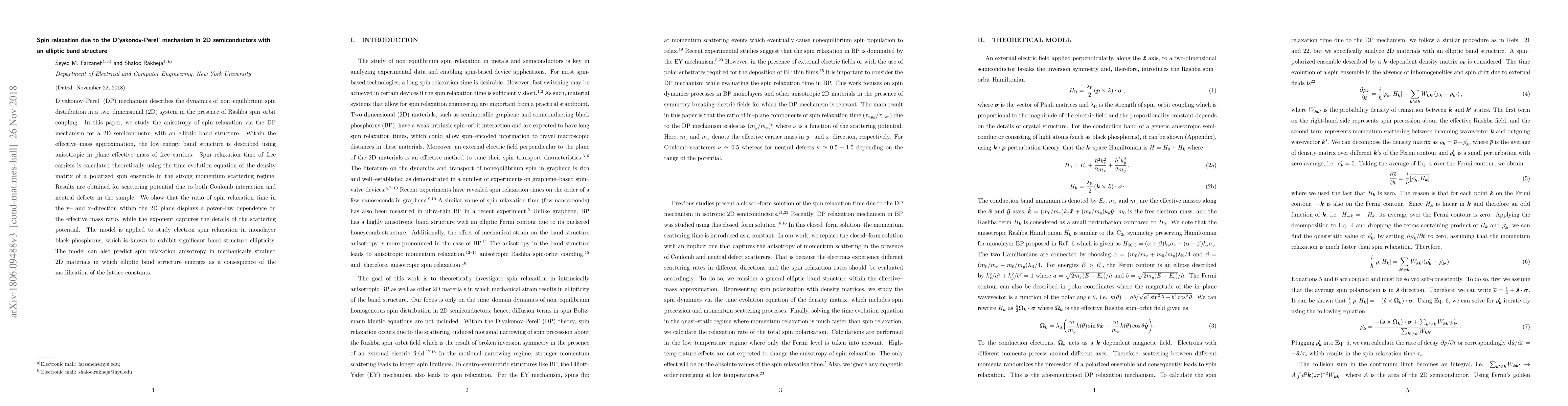 This paper investigates the spin relaxation dynamics due to the D'yakonov-Perel' mechanism in 2D semiconductors with an elliptic band structure, revealing a power-law dependence of spin relaxation anisotropy on the effective mass ratio and the scattering potential. The model is applied to monolayer black phosphorus and strained 2D materials.