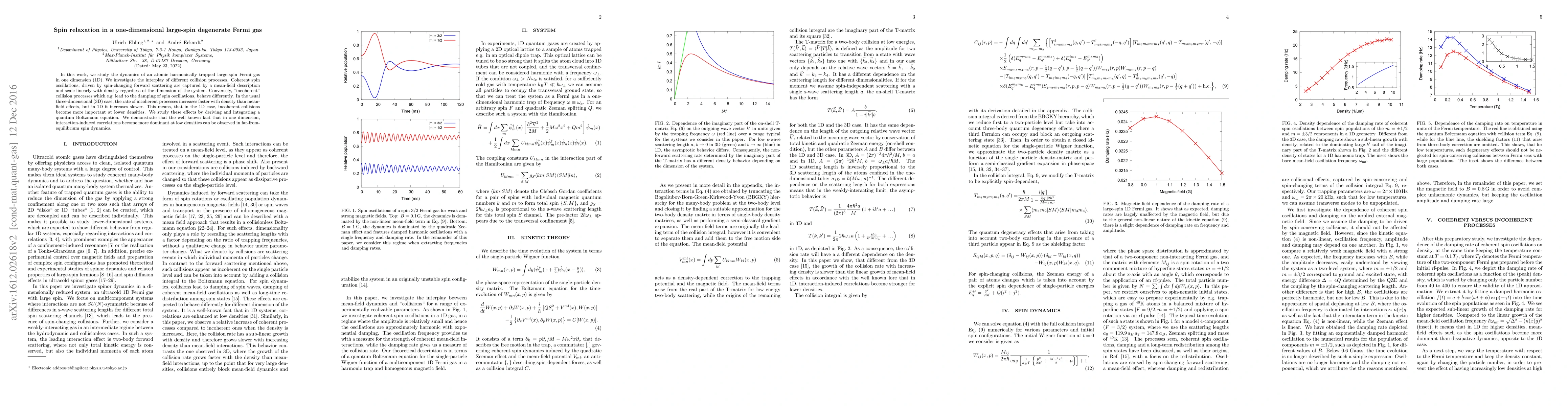 This paper investigates the spin relaxation dynamics in a one-dimensional large-spin degenerate Fermi gas, highlighting the differing behaviors of coherent and incoherent collision processes. While coherent spin oscillations scale linearly with density, incoherent processes, which dampen spin oscillations, increase slower with density in 1D compared to 3D, making them more significant at lower densities.