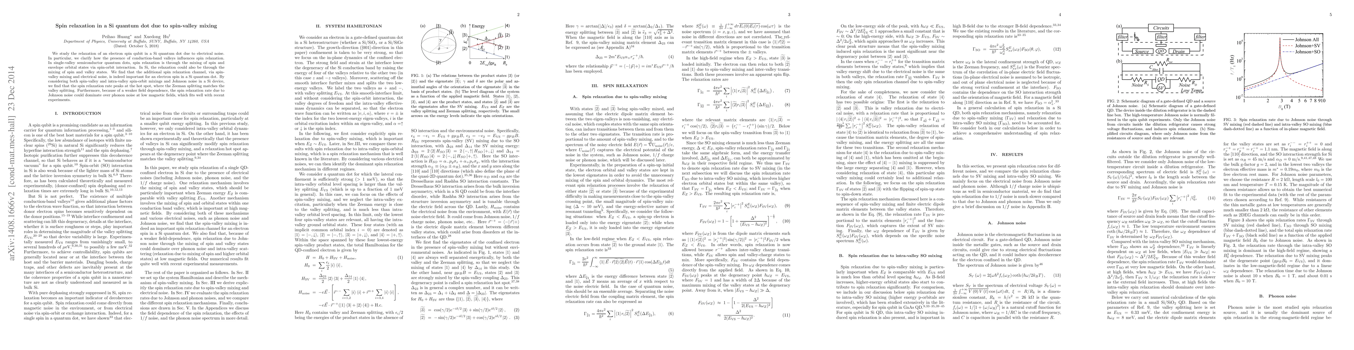 This paper investigates electron spin relaxation in a silicon quantum dot, highlighting the role of spin-valley mixing due to electrical noise. It finds that the spin relaxation rate peaks when Zeeman splitting matches valley splitting, and that Johnson noise can dominate over phonon noise at low magnetic fields.