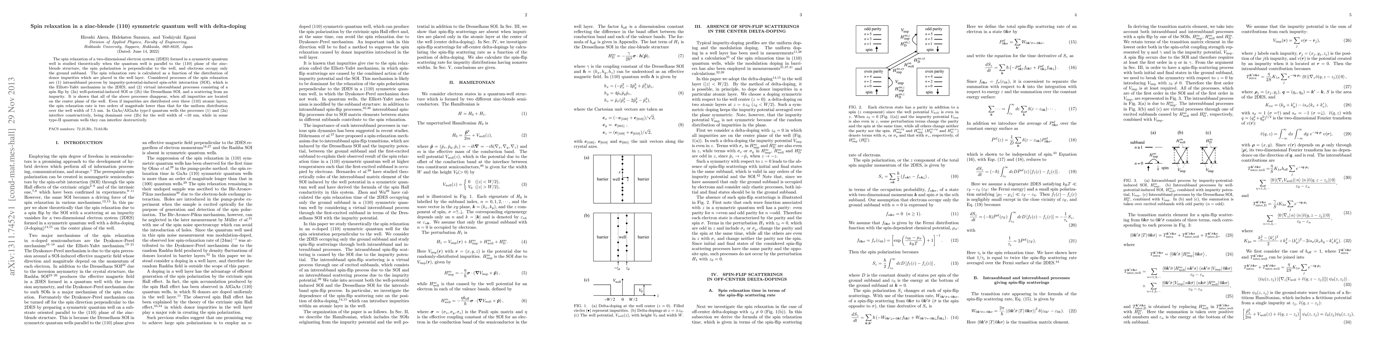 The spin relaxation of a two-dimensional electron system (2DES) formed in a symmetric quantum well is studied theoretically when the quantum well is parallel to the (110) plane of the zinc-blende structure, the spin polarization is perpendicular to the well, and electrons occupy only the ground subband. The spin relaxation rate is calculated as a function of the distribution of donor impurities which are placed in the well layer. Considered processes of the spin relaxation are (1) intrasubband process by impurity-potential-induced spin-orbit interaction (SOI), which is the Elliott-Yafet mechanism in the 2DES, and (2) virtual intersubband processes consisting of a spin flip by (2a) well-potential-induced SOI or (2b) the Dresselhaus SOI, and a scattering from an impurity. It is shown that all of the above processes disappear, when all impurities are located on the center plane of the well. Even if impurities are distributed over three (110) atomic layers, the spin relaxation rate is two orders of magnitude lower than that for the uniform distribution over the well width of 7.5\ nm. In GaAs/AlGaAs type-I quantum wells the processes (1) and (2a) interfere constructively, being dominant over (2b) for the well width of $\sim$10\ nm, while in some type-II quantum wells they can interfere destructively.