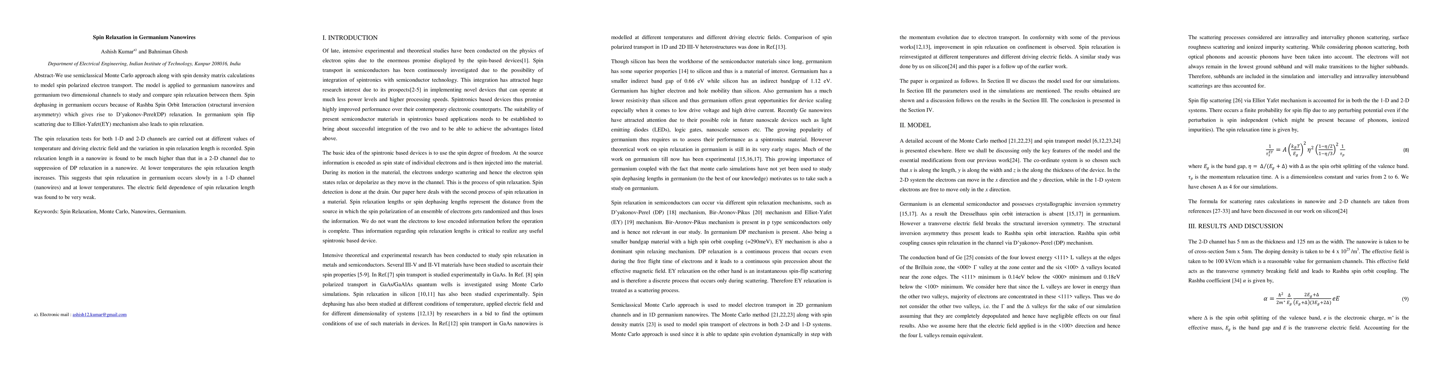 We use semiclassical Monte Carlo approach along with spin density matrix calculations to model spin polarized electron transport. The model is applied to germanium nanowires and germanium two dimensional channels to study and compare spin relaxation between them. Spin dephasing in germanium occurs because of Rashba Spin Orbit Interaction (structural inversion asymmetry) which gives rise to D'yakonov-Perel(DP) relaxation. In germanium spin flip scattering due to Elliot-Yafet(EY) mechanism also leads to spin relaxation. The spin relaxation tests for both 1-D and 2-D channels are carried out at different values of temperature and driving electric field and the variation in spin relaxation length is recorded. Spin relaxation length in a nanowire is found to be much higher than that in a 2-D channel due to suppression of DP relaxation in a nanowire. At lower temperatures the spin relaxation length increases. This suggests that spin relaxation in germanium occurs slowly in a 1-D channel (nanowires) and at lower temperatures. The electric field dependence of spin relaxation length was found to be very weak.