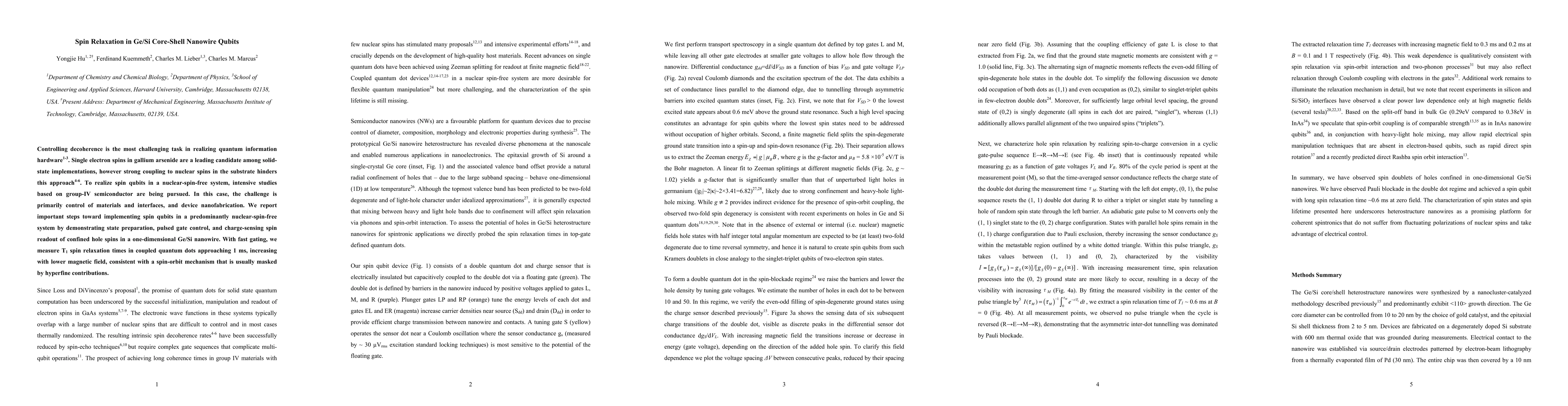 This paper reports progress in developing spin qubits in Ge/Si core-shell nanowires, achieving state preparation, pulsed gate control, and charge-sensing spin readout of hole spins. The study measures T1 spin relaxation times up to 1 ms, indicating a spin-orbit mechanism that dominates over hyperfine interactions.