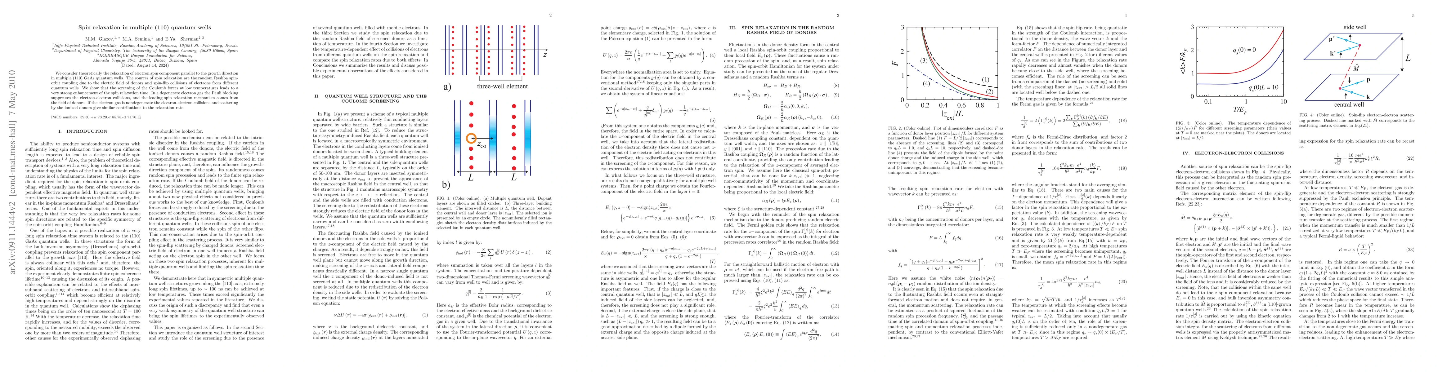 This paper theoretically investigates spin relaxation in multiple (110) GaAs quantum wells, attributing it mainly to Rashba spin-orbit coupling and electron-electron collisions. It finds that low-temperature screening enhances spin relaxation time significantly, with dominant mechanisms varying depending on electron gas degeneracy.