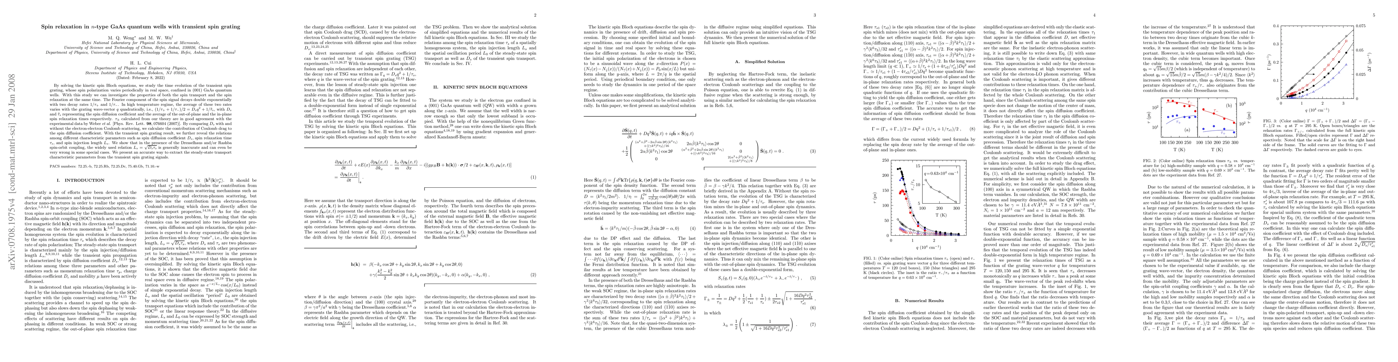 By solving the kinetic spin Bloch equations, we study the time evolution of the transient spin grating, whose spin polarization varies periodically in real space, confined in (001) GaAs quantum wells. With this study we can investigate the properties of both the spin transport and the spin relaxation at the same time. The Fourier component of the spin signal decays double exponentially with two decay rates $1/\tau_+$ and $1/\tau_-$. In high temperature regime, the average of these two rates varies with the grating wave-vector $q$ quadratically, i.e., $(1/\tau_++1/\tau_-)/2=D_sq^2+1/\tilde{\tau}_s$, with $D_s$ and $\tilde{\tau}_s$ representing the spin diffusion coefficient and the average of the out-of-plane and the in-plane spin relaxation times respectively. $\tau_{\pm}$ calculated from our theory are in good agreement with the experimental data by Weber {\em et al.} [Phys. Rev. Lett. {\bf 98}, 076604 (2007)]. By comparing $D_s$ with and without the electron-electron Coulomb scattering, we calculate the contribution of Coulomb drag to the spin diffusion coefficient. With the transient spin grating result, we further reveal the relations among different characteristic parameters such as spin diffusion coefficient $D_s$, spin relaxation time $\tau_s$, and spin injection length $L_s$. We show that in the presence of the Dresselhaus and/or Rashba spin-orbit coupling, the widely used relation $L_s=\sqrt{D_s\tau_s}$ is generally inaccurate and can even be very wrong in some special cases. We present an accurate way to extract the steady-state transport characteristic parameters from the transient spin grating signals.