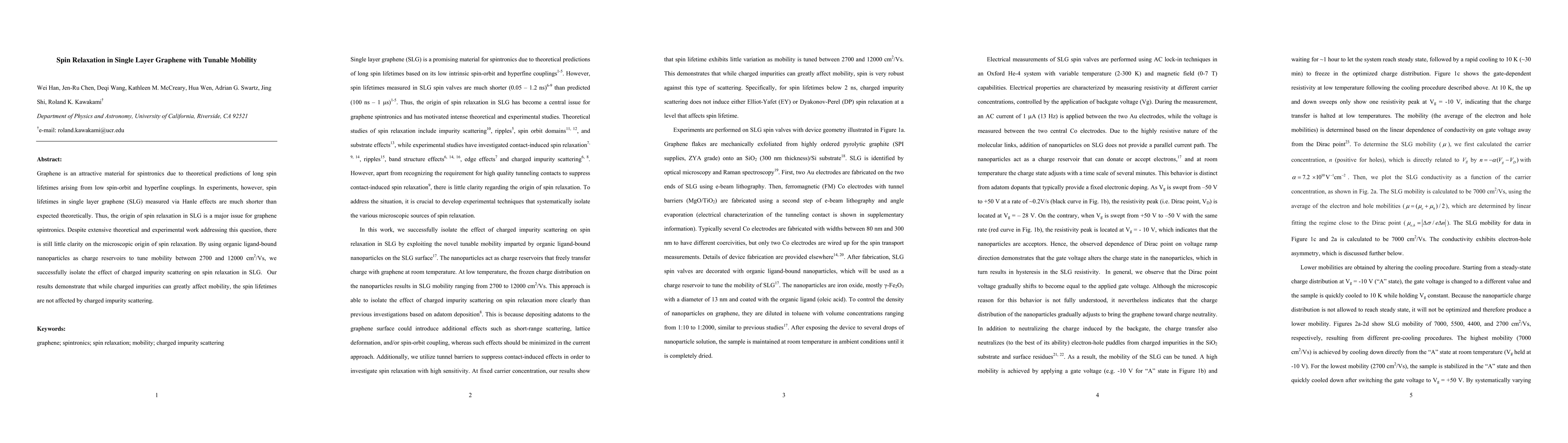 This study investigates spin relaxation in single layer graphene (SLG) and finds that despite the ability of organic ligand-bound nanoparticles to tune mobility, spin lifetimes remain unaffected by charged impurity scattering, highlighting the need for further research into the microscopic origins of spin relaxation in SLG.