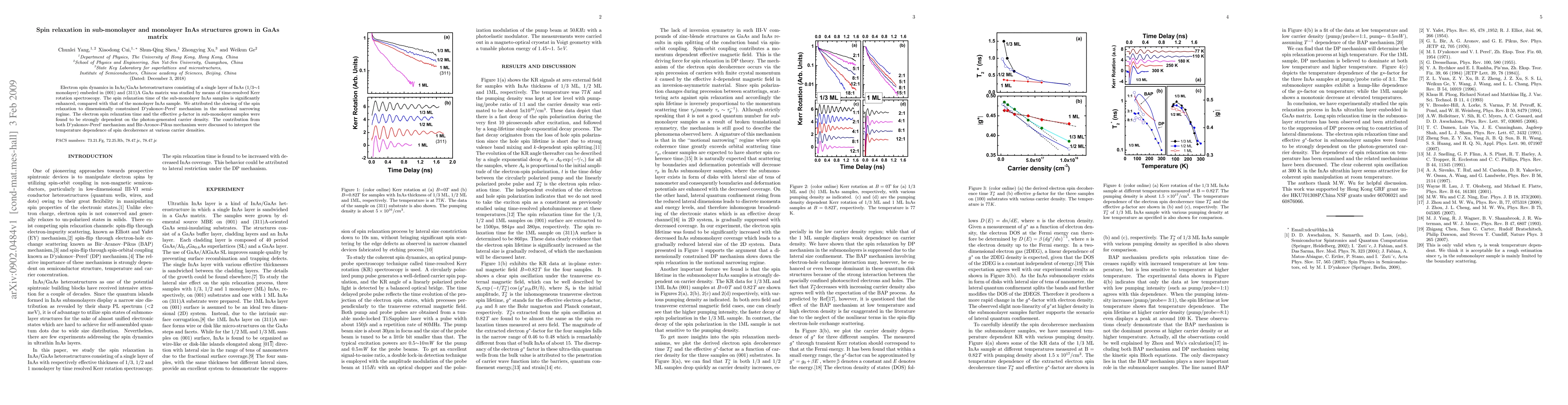 This study investigates electron spin relaxation in sub-monolayer and monolayer InAs structures embedded in GaAs matrices using time-resolved Kerr rotation spectroscopy. The research finds enhanced spin relaxation times in sub-monolayer samples compared to monolayers, attributing the effect to the dimensionally constrained D'yakonov-Perel' mechanism and its dependence on photon-generated carrier density.