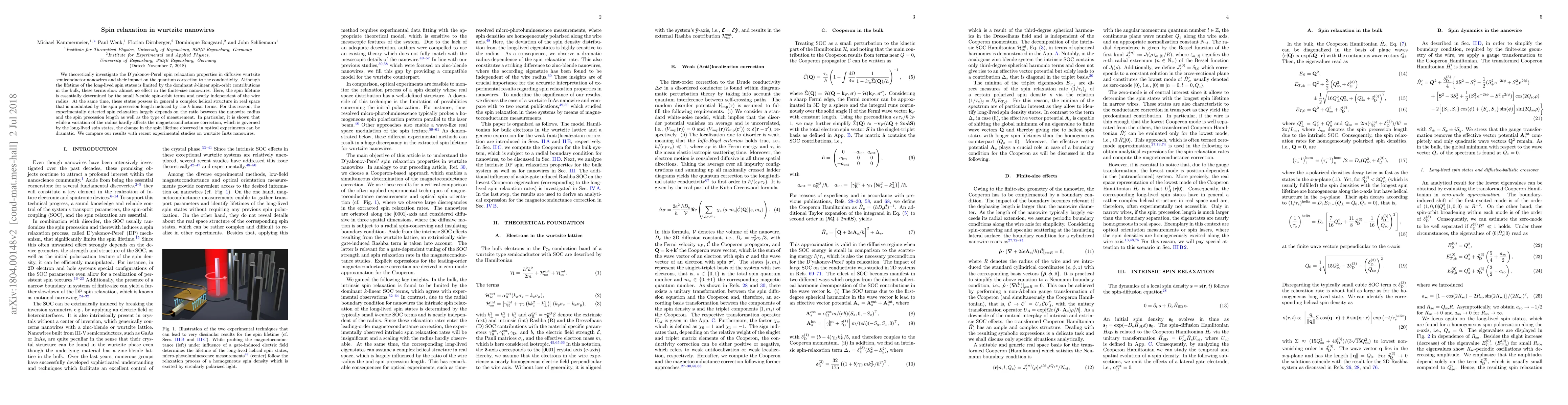 We theoretically investigate the D'yakonov-Perel' spin relaxation properties in diffusive wurtzite semiconductor nanowires and their impact on the quantum correction to the conductivity. Although the lifetime of the long-lived spin states is limited by the dominant $k$-linear spin-orbit contributions in the bulk, these terms show almost no effect in the finite-size nanowires. Here, the spin lifetime is essentially determined by the small $k$-cubic spin-orbit terms and nearly independent of the wire radius. At the same time, these states possess in general a complex helical structure in real space that is modulated by the spin precession length induced by the $k$-linear terms. For this reason, the experimentally detected spin relaxation largely depends on the ratio between the nanowire radius and the spin precession length as well as the type of measurement. In particular, it is shown that while a variation of the radius hardly affects the magnetoconductance correction, which is governed by the long-lived spin states, the change in the spin lifetime observed in optical experiments can be dramatic. We compare our results with recent experimental studies on wurtzite InAs nanowires.