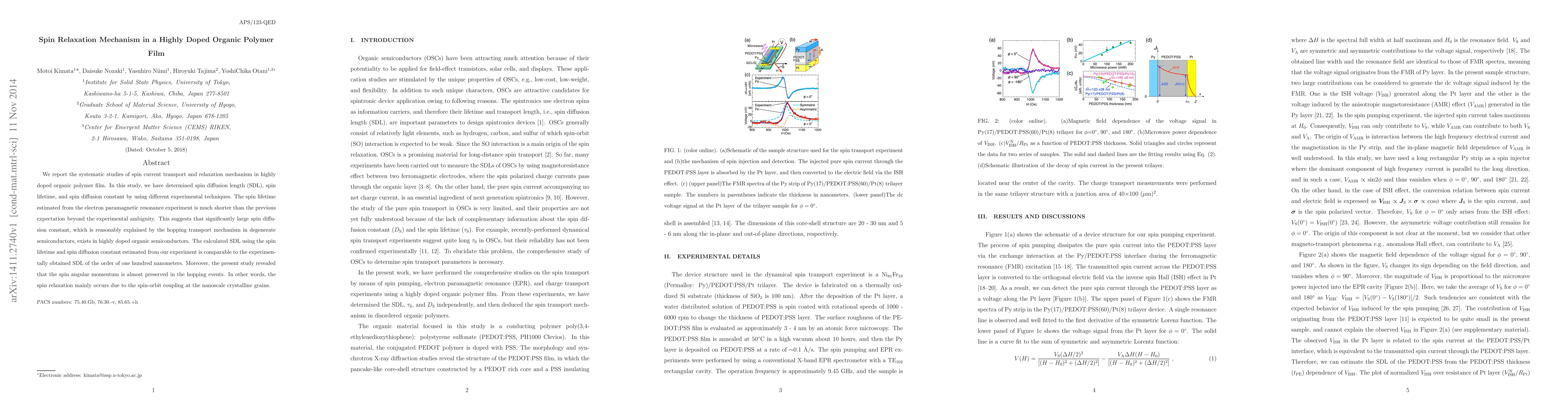 Summary: This study investigates spin relaxation mechanisms in highly doped organic polymer films, finding a much shorter spin lifetime than previously expected. The results indicate a large spin diffusion constant explained by hopping transport, with spin angular momentum largely preserved during hopping events, suggesting spin relaxation mainly due to spin-orbit coupling at nanoscale crystalline grains.